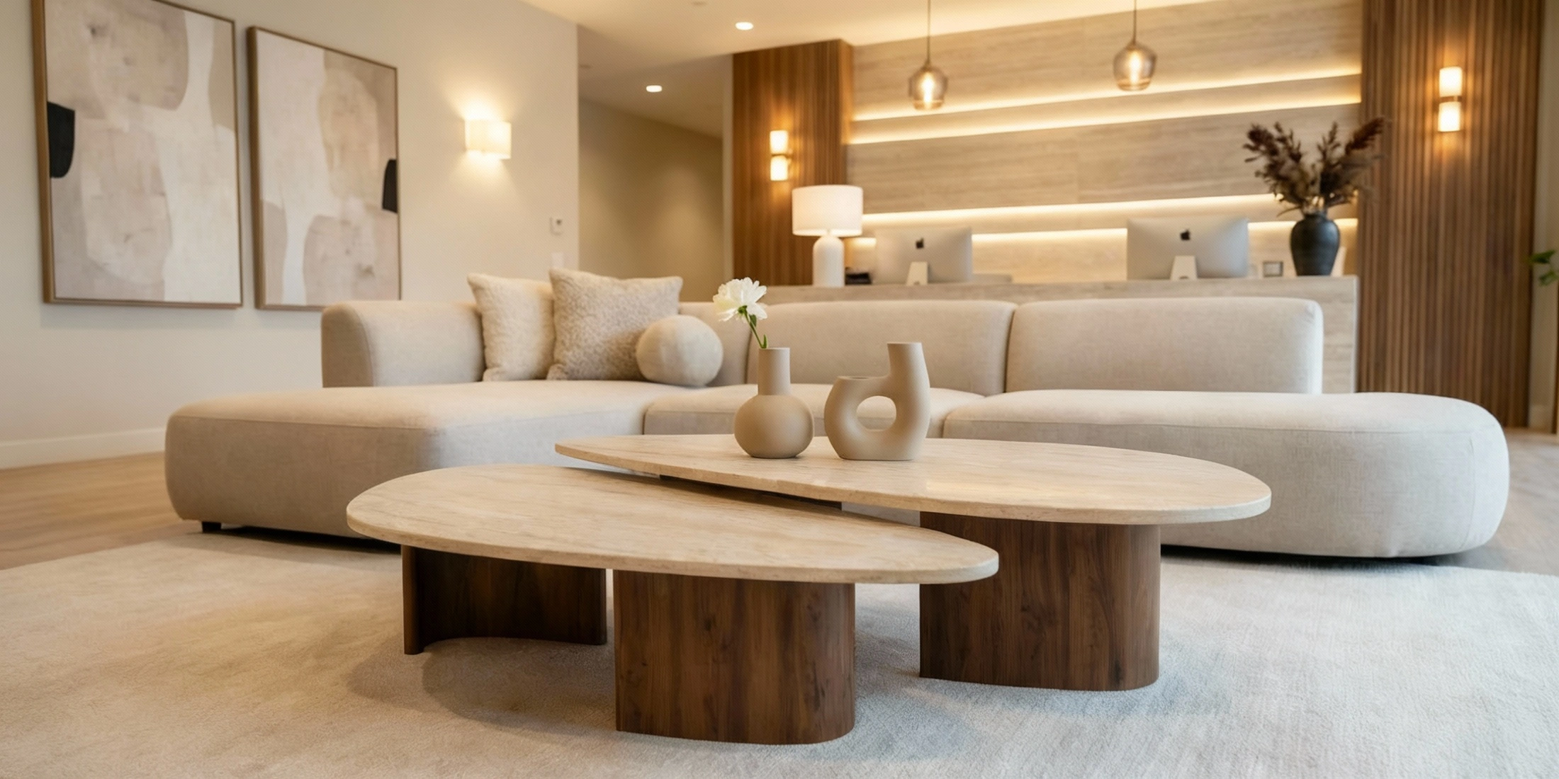 The smooth travertine tops rest gracefully on sturdy walnut bases, showcasing the harmonious blend of materials.