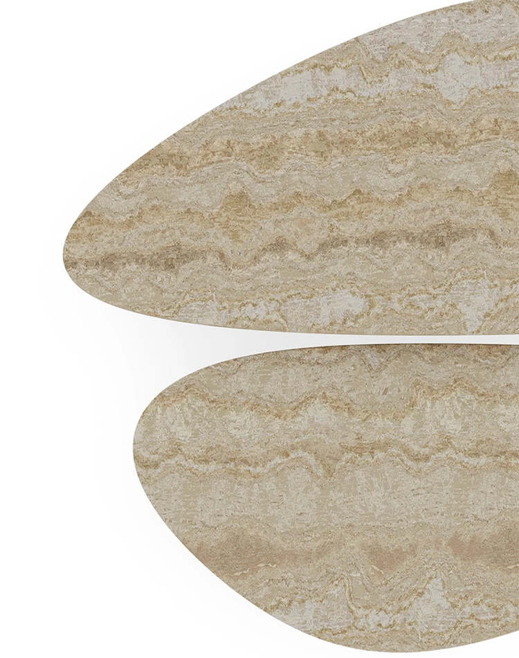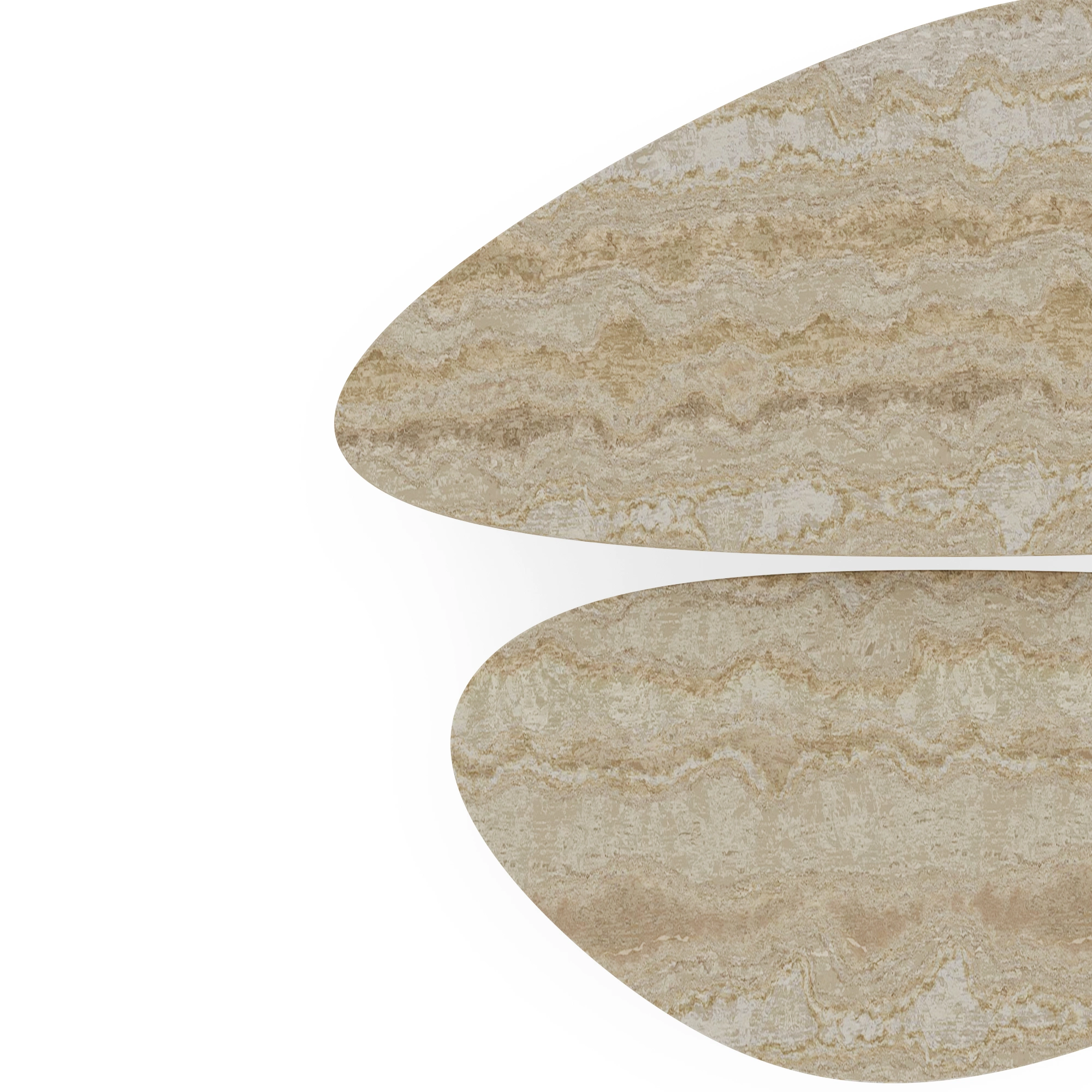 The top is book-matched travertine set on a pared base, a study in veined stone, honed surface and careful stone cutting. The piece borrows the measured language of an organic form to emphasise material clarity.