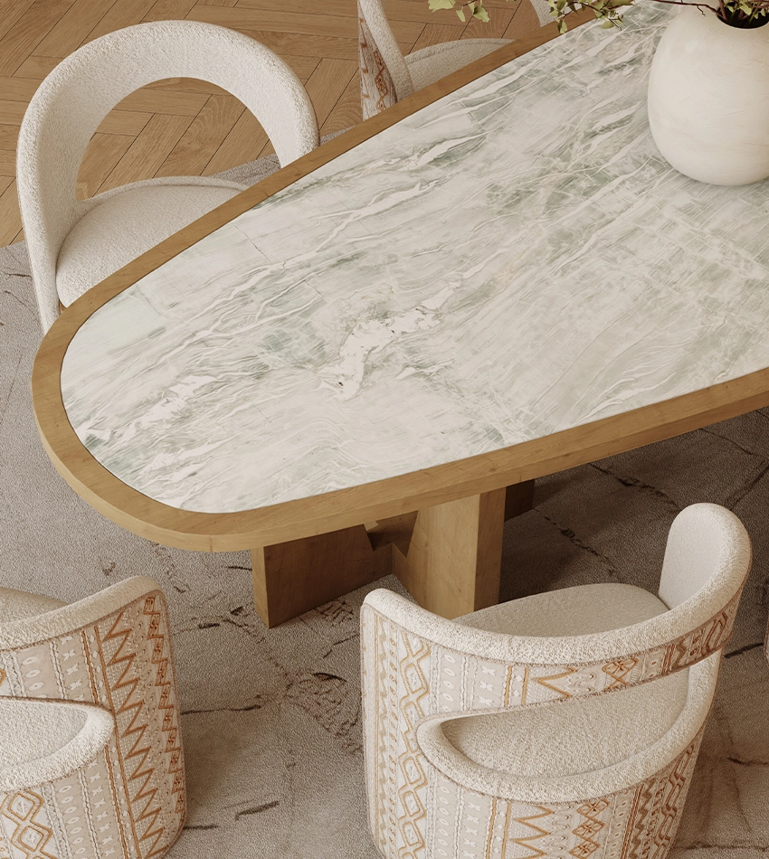 The Alba Dining Table expresses the elegance of form through natural materials and precise craftsmanship. This designer stone top dining table pairs a softly contoured travertine surface with a sculpted oak base, creating a dialogue between solidity and lightness. The interplay of textures defines its character, organic yet architectural, refined yet grounded. As a sculptural travertine dining table with wood base, Alba embodies timeless sophistication and material harmony. Thoughtfully proportioned for contemporary interiors, this luxury oak dining table transforms gatherings into design statements. With its flowing silhouette and artisanal finish, Alba stands as a premium organic-shape dining table that celebrates the art of modern craftsmanship.