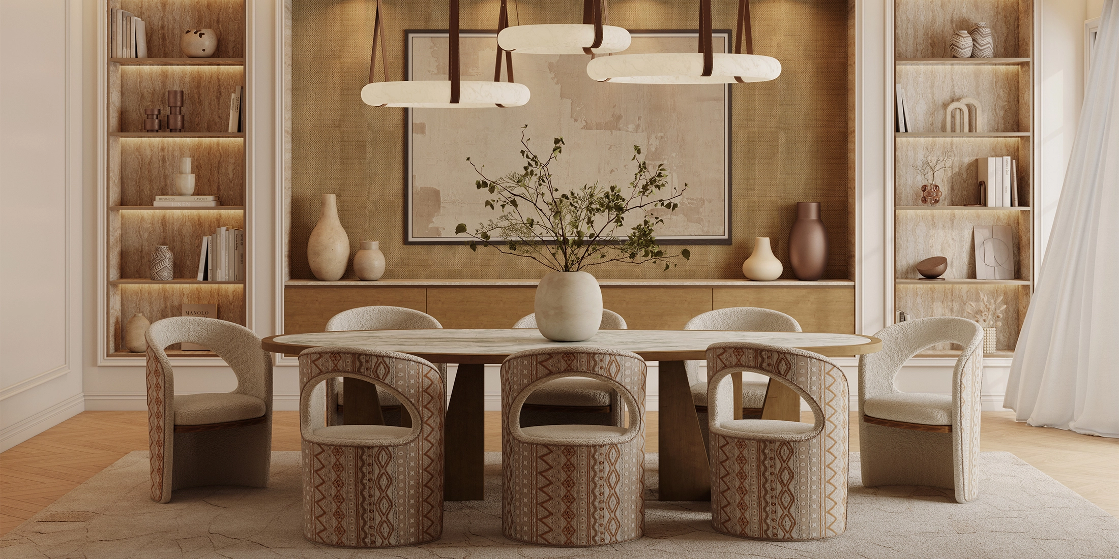 The Alba Dining Table expresses the elegance of form through natural materials and precise craftsmanship. This designer stone top dining table pairs a softly contoured travertine surface with a sculpted oak base, creating a dialogue between solidity and lightness. The interplay of textures defines its character, organic yet architectural, refined yet grounded. As a sculptural travertine dining table with wood base, Alba embodies timeless sophistication and material harmony. Thoughtfully proportioned for contemporary interiors, this luxury oak dining table transforms gatherings into design statements. With its flowing silhouette and artisanal finish, Alba stands as a premium organic-shape dining table that celebrates the art of modern craftsmanship.