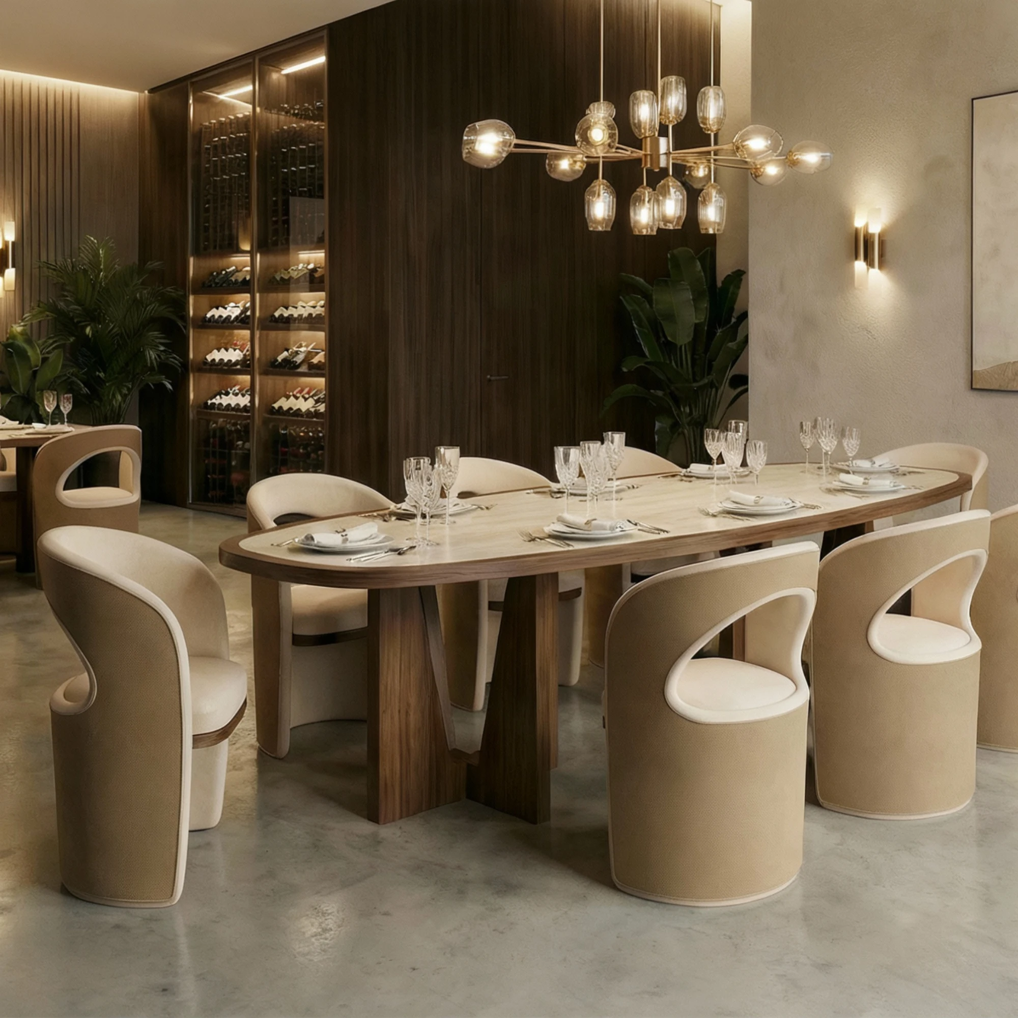 The proportions encourage sociable arrangement, the surface sits warm under low light and gives the table a steady presence and an accessible tactility that suits family meals and formal dinners alike.