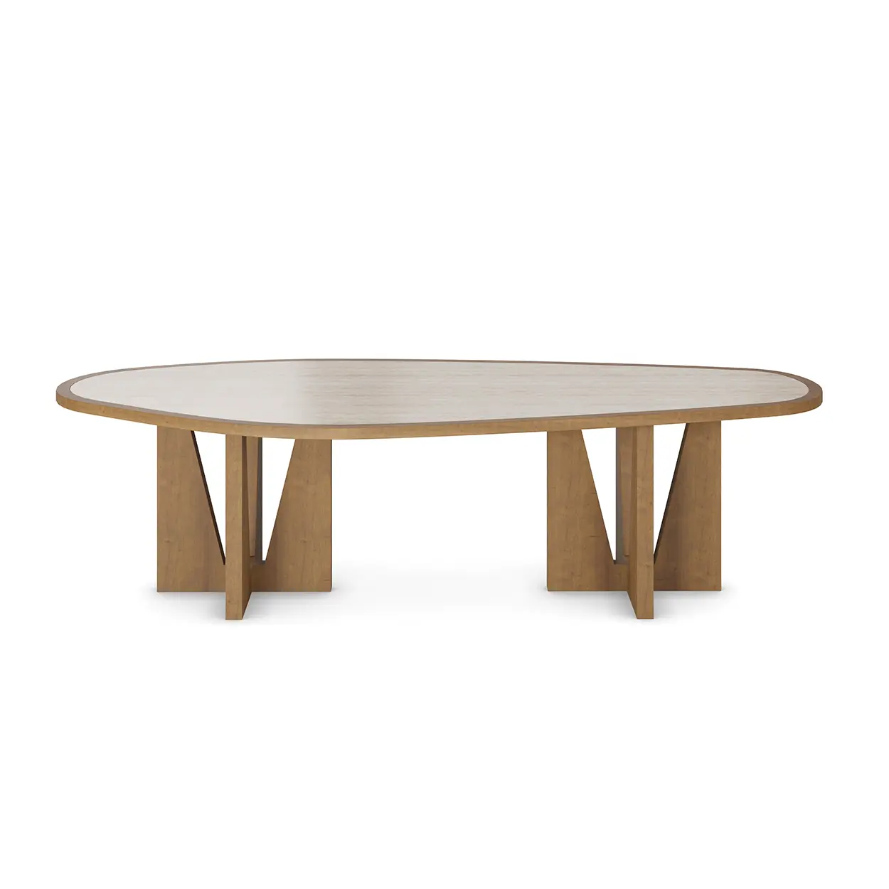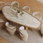 The Alba Dining Table by Nolita Harbour combines a smooth travertine top with subtle veining and an organic shape, resting on an architectural oak base with angled legs—a perfect blend of natural elegance and modern design, ideal for any stylish dining space.