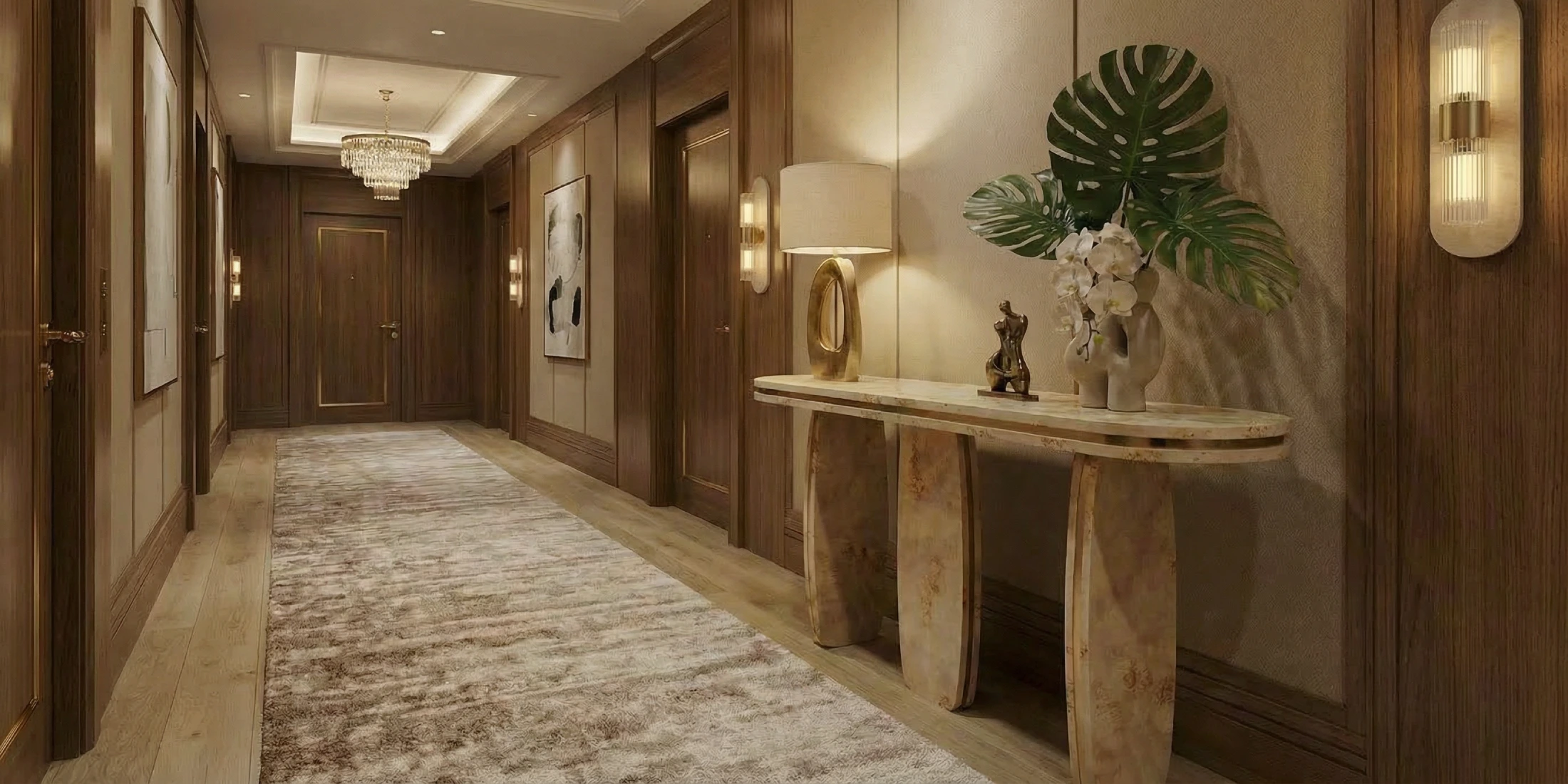 Its compact plan provides a tactile landing for objects and light, offering a composed presence and a subtle sense of rhythm along a hall or living wall.