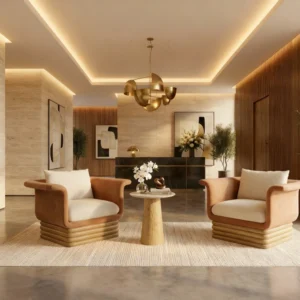 The Assia dining table exudes contemporary luxury with its rich poplar root grain, sculptural legs, and elegant brass accents – an ideal centerpiece for any dining setting.