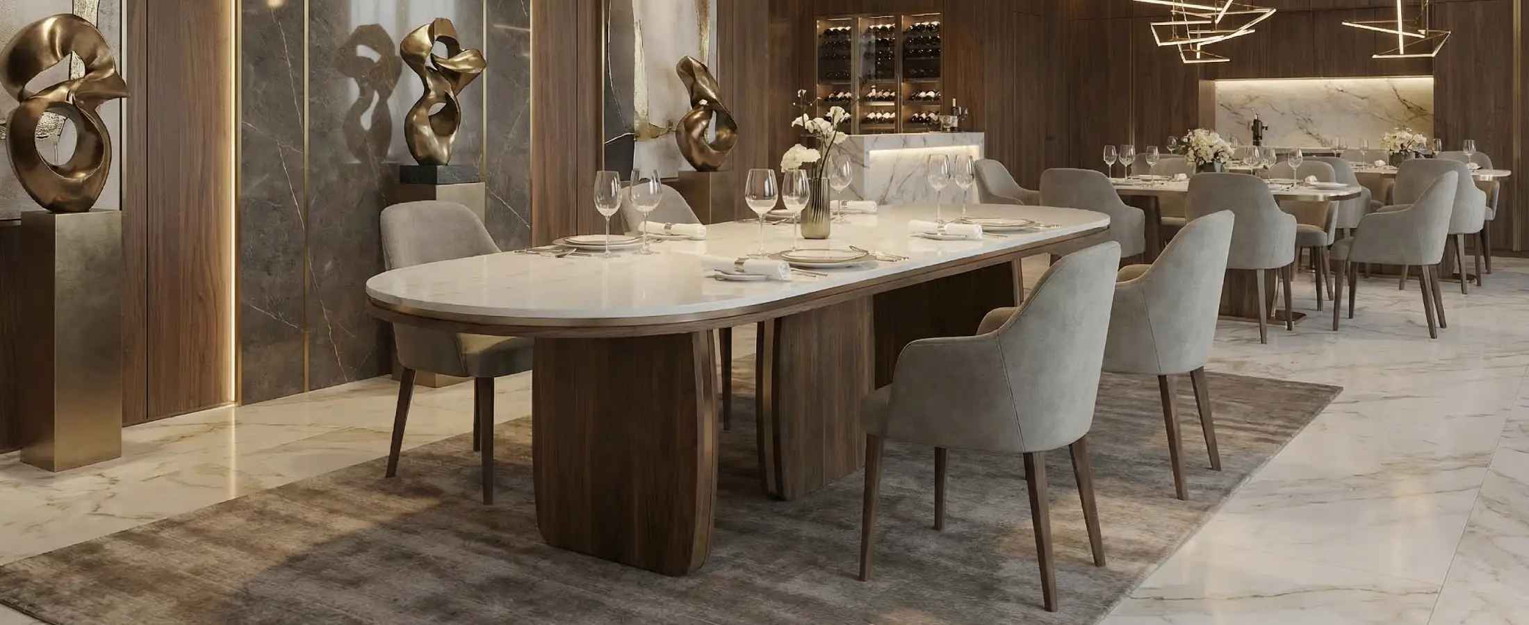 Elevate your dining experience with the Assia Table – where natural elegance meets sculptural design, crafted in walnut and travertine for a timeless statement.