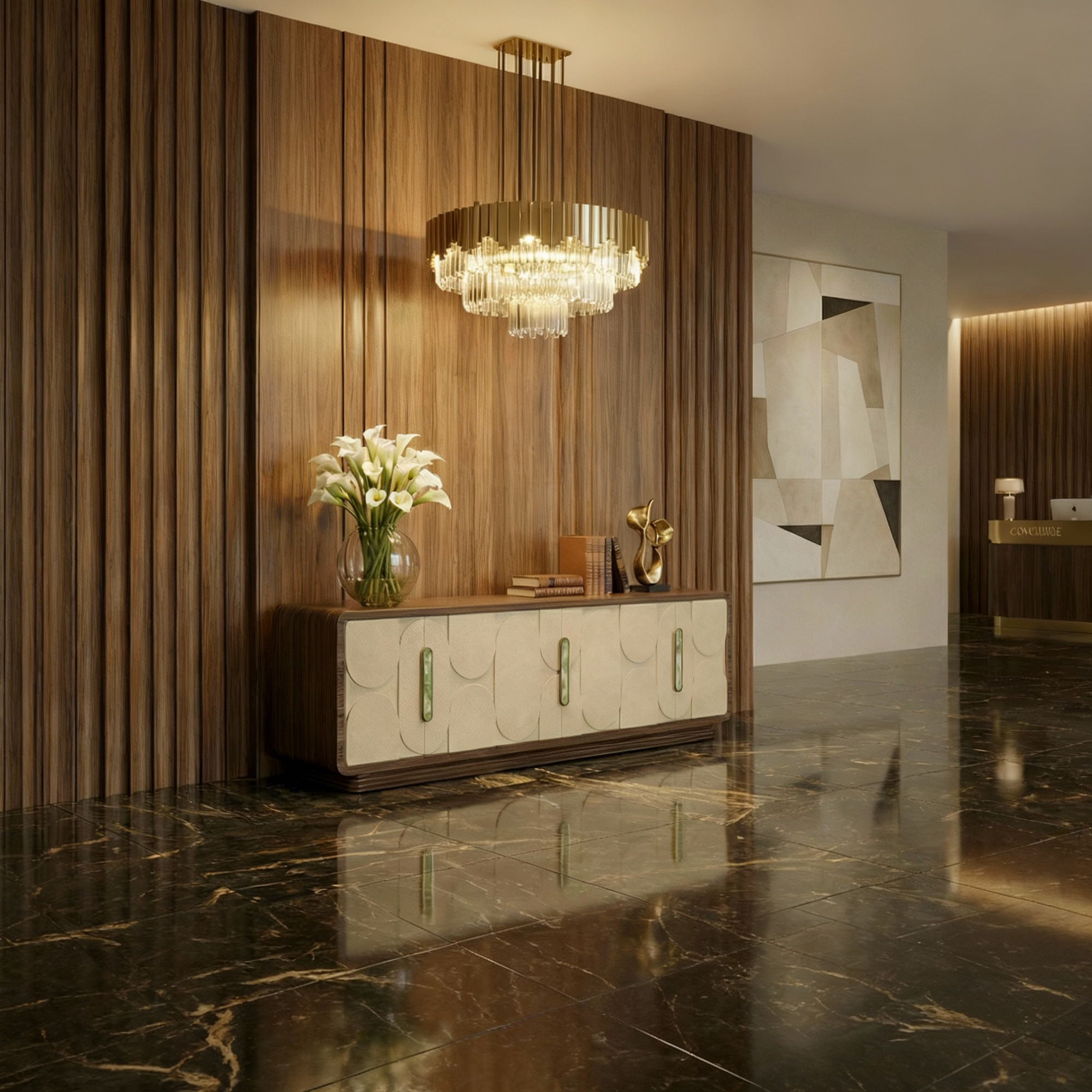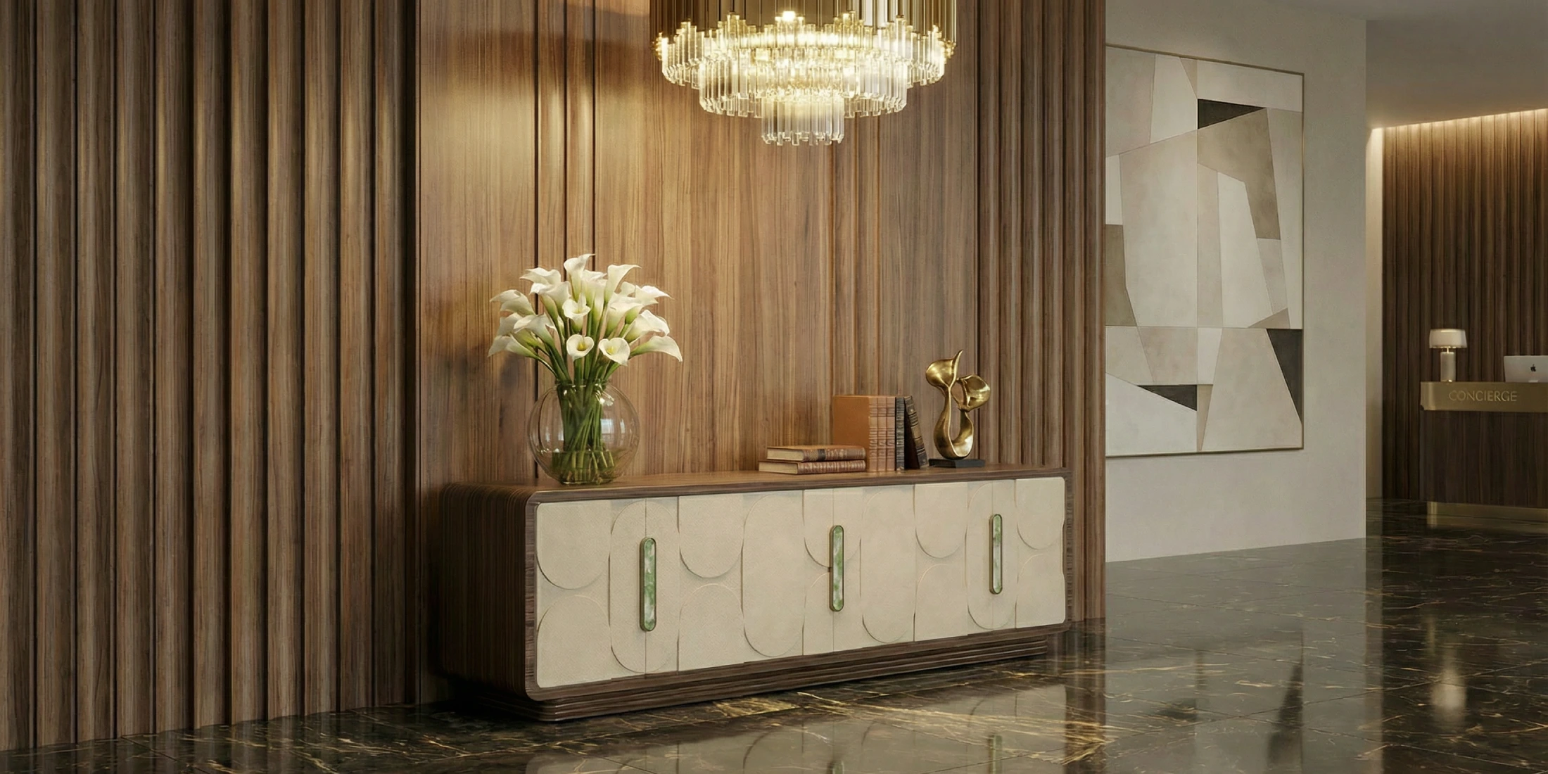 Its presence aligns with a contemporary statement sideboard, offering generous storage while maintaining a disciplined exterior. The material interplay creates a console in ebony wood that remains calm and confidently structured from every viewpoint.
