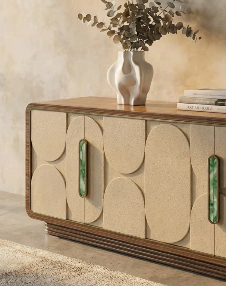 Crafted with precision, the piece introduces ceramic and brass handles that break the plane with measured detailing. The richness of ebony wood is balanced by a sculpted plaster finish, giving the surface a subtle topography that reads refined rather than ornamental.