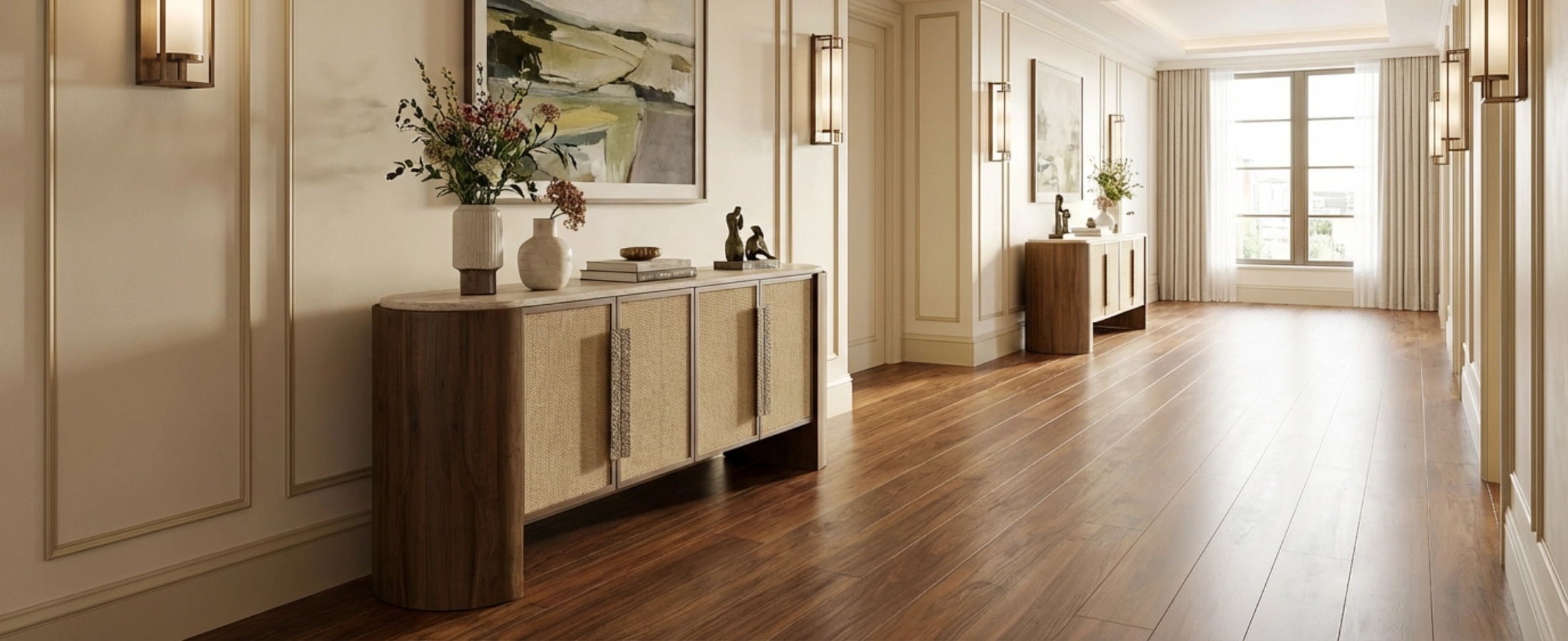 Its character aligns with a handcrafted walnut buffet with travertine top, offering concealed storage behind a continuous, calm rhythm. The proportion and material clarity support an elegant storage console for modern interiors, refined from every angle.