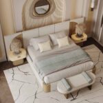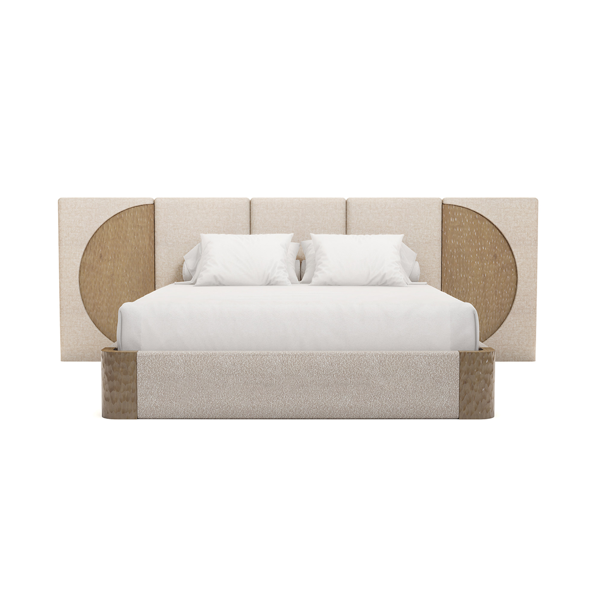The Claude Bed combines carved varnished oak with plush bouclé fabric, featuring an oversized headboard with artistic circular detailing—a luxurious blend of texture and modern elegance, perfect for sophisticated bedroom spaces.