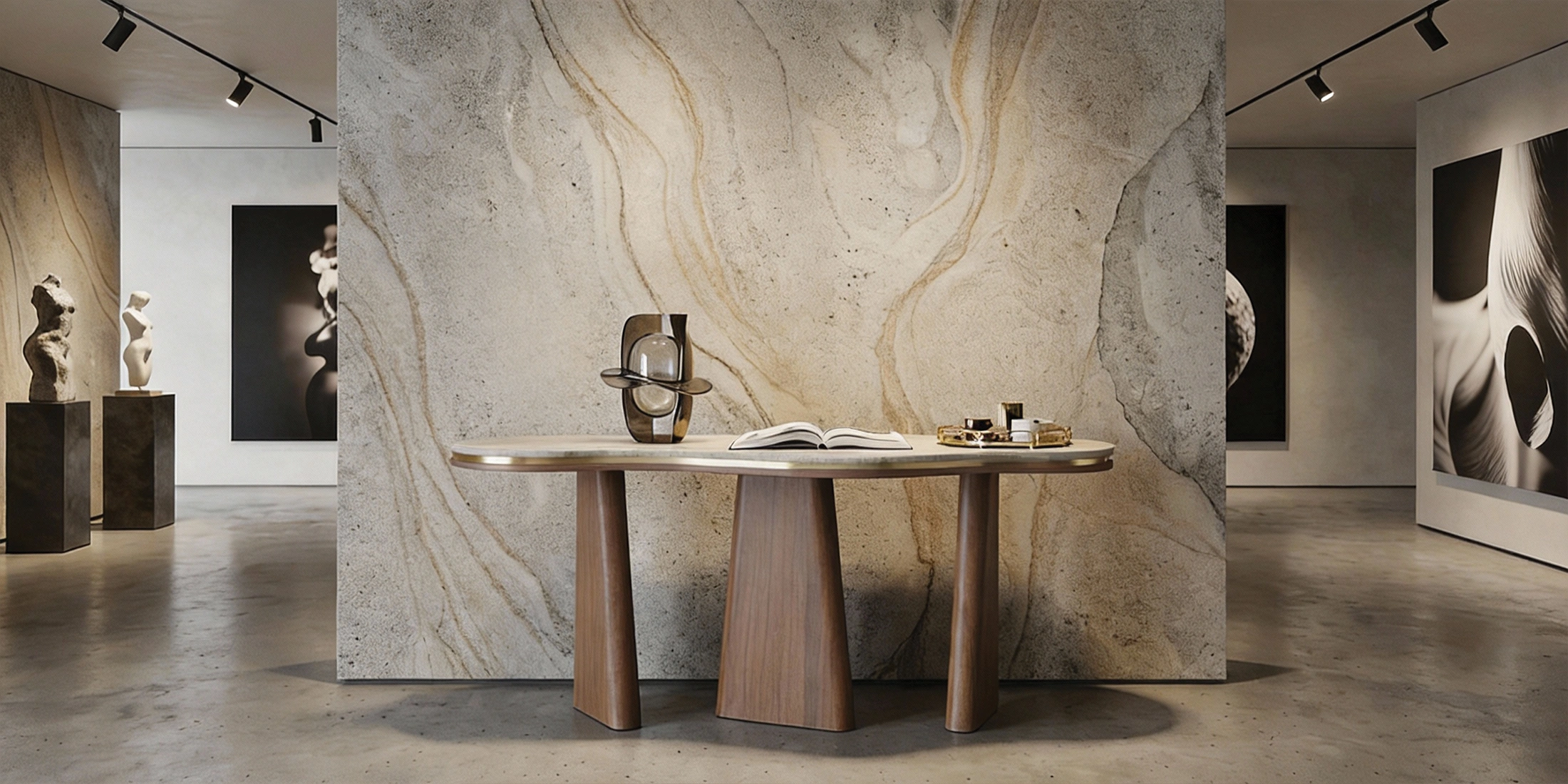Customize stone, metal, and timber finishes to suit your palette. Explore all available materials on the Samples page to specify the Noria Console with precision.