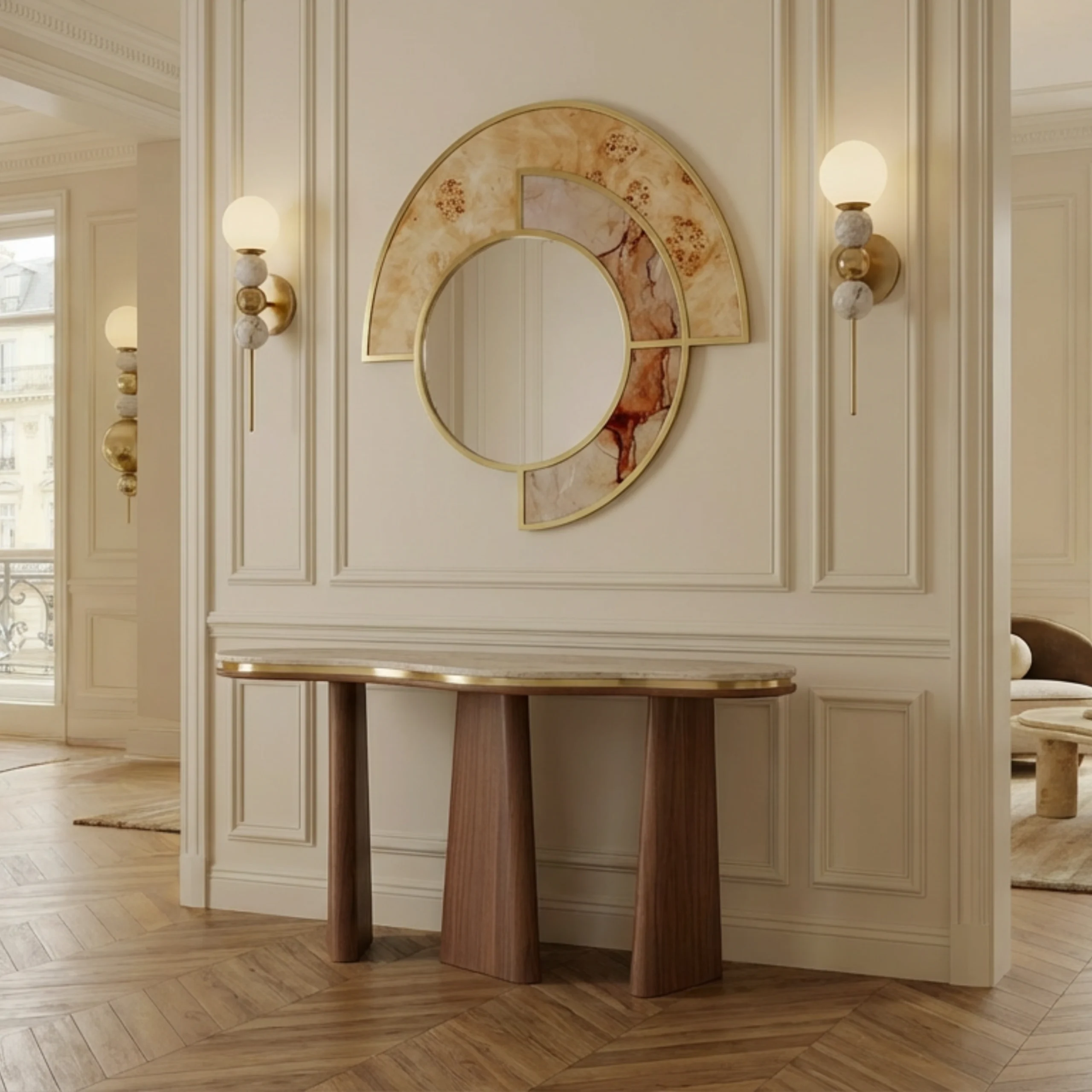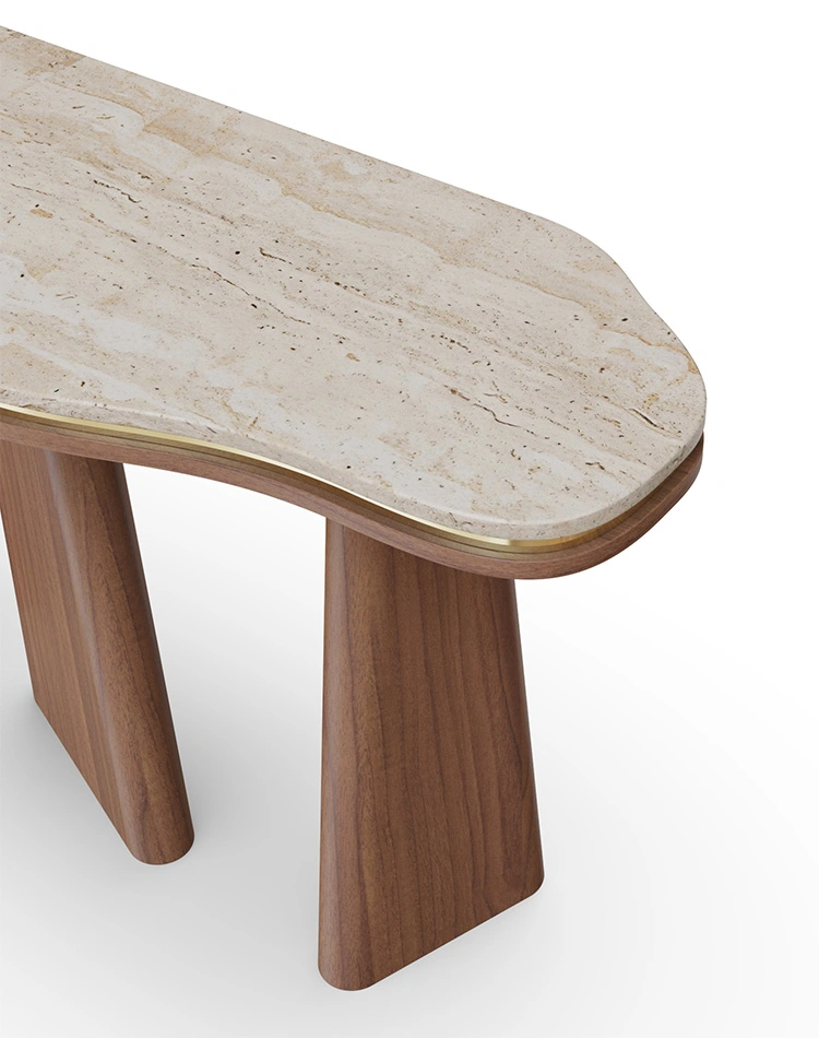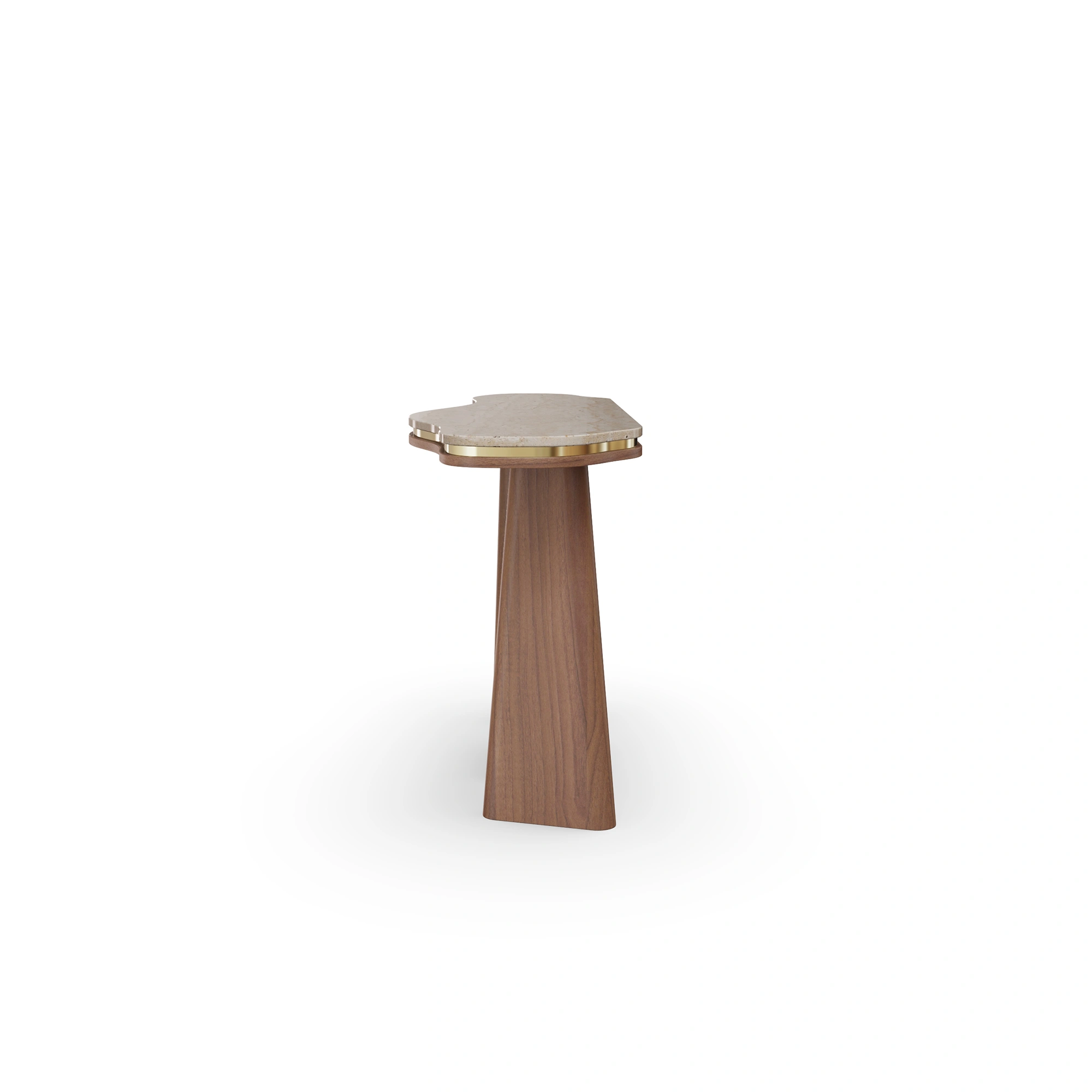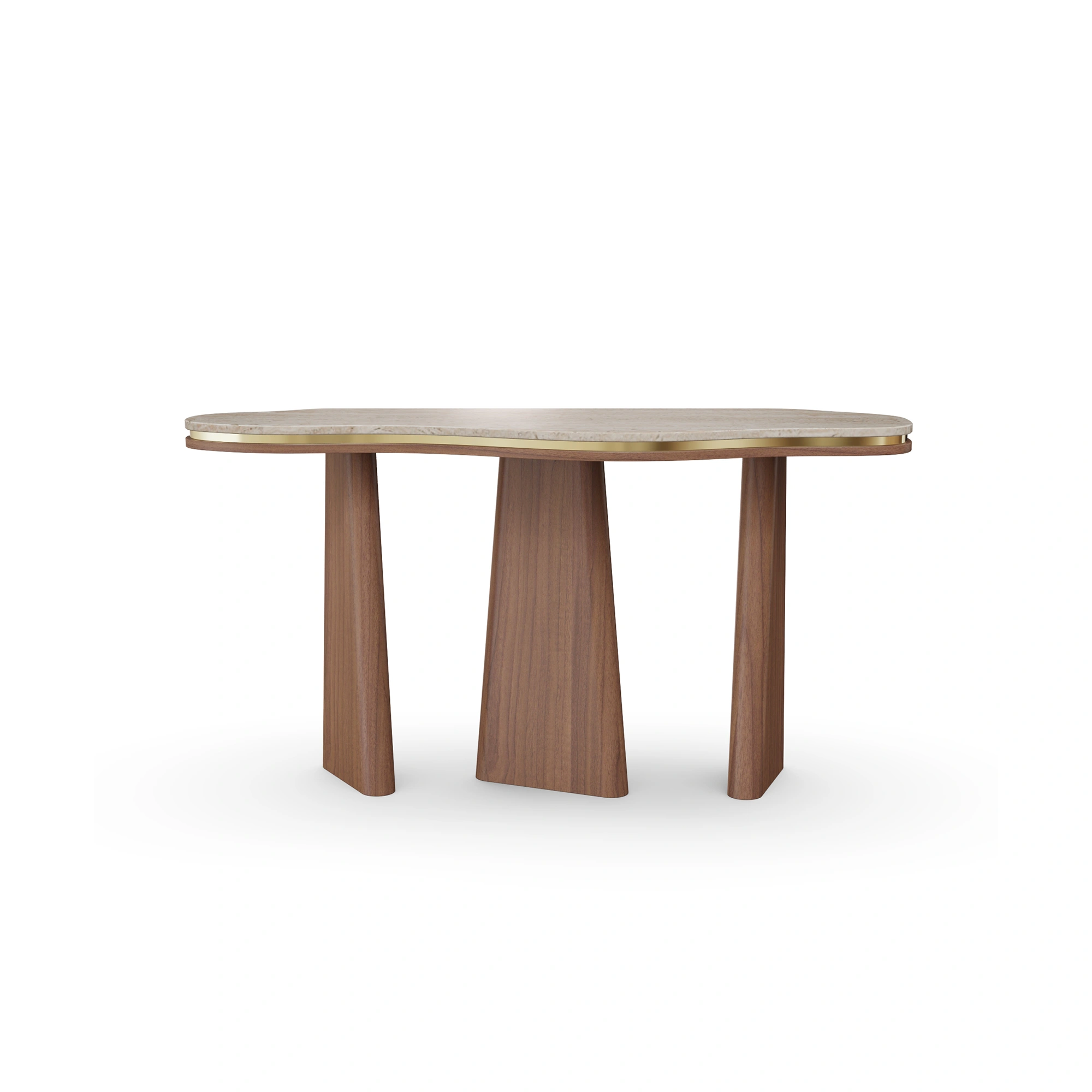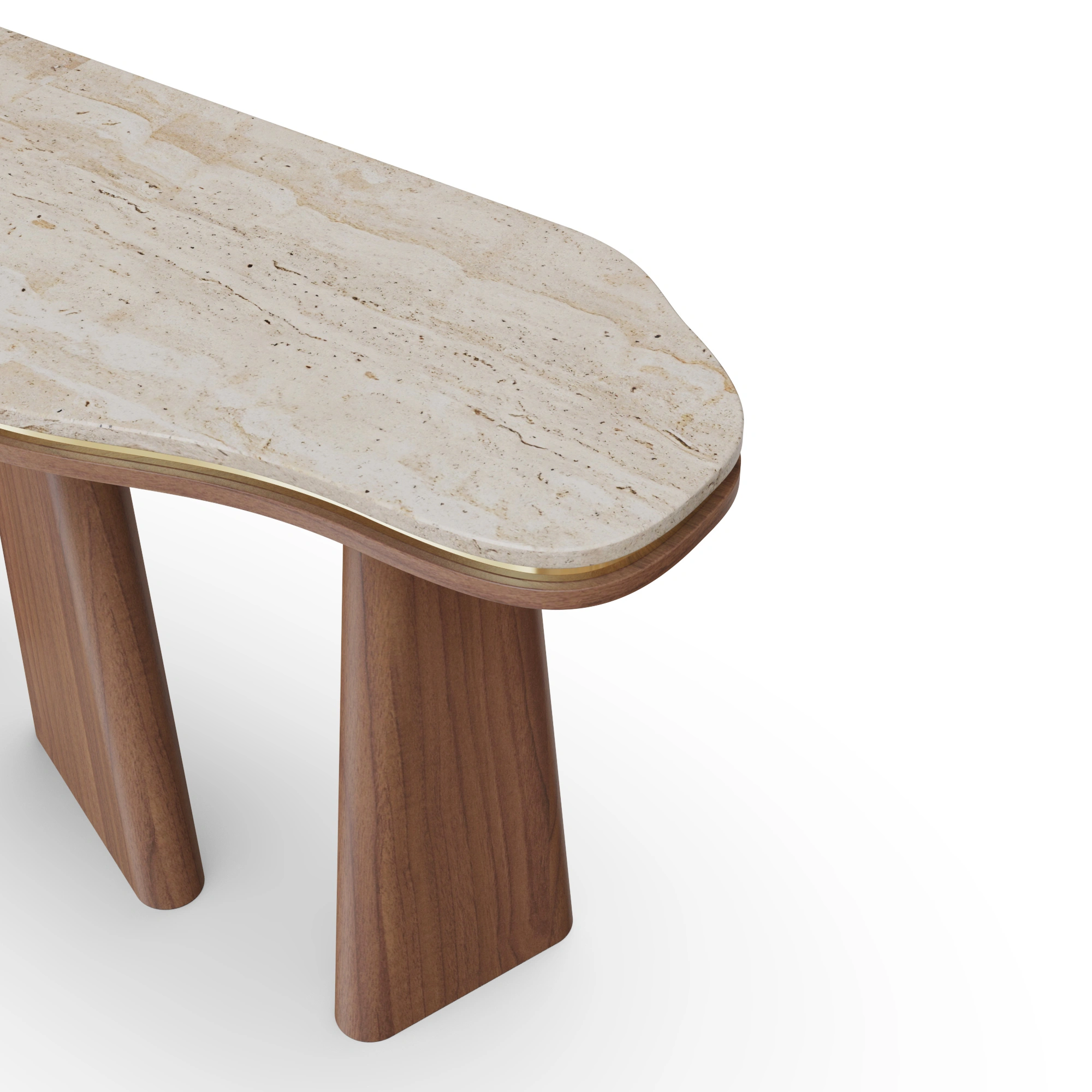The Noria Console pairs an organically contoured stone top with sculptural, tapered walnut legs, creating a balanced dialogue between fluid form and architectural structure. A subtle brass inlay highlights the edge of the top, adding a gentle note of refinement to its quiet, understated elegance.