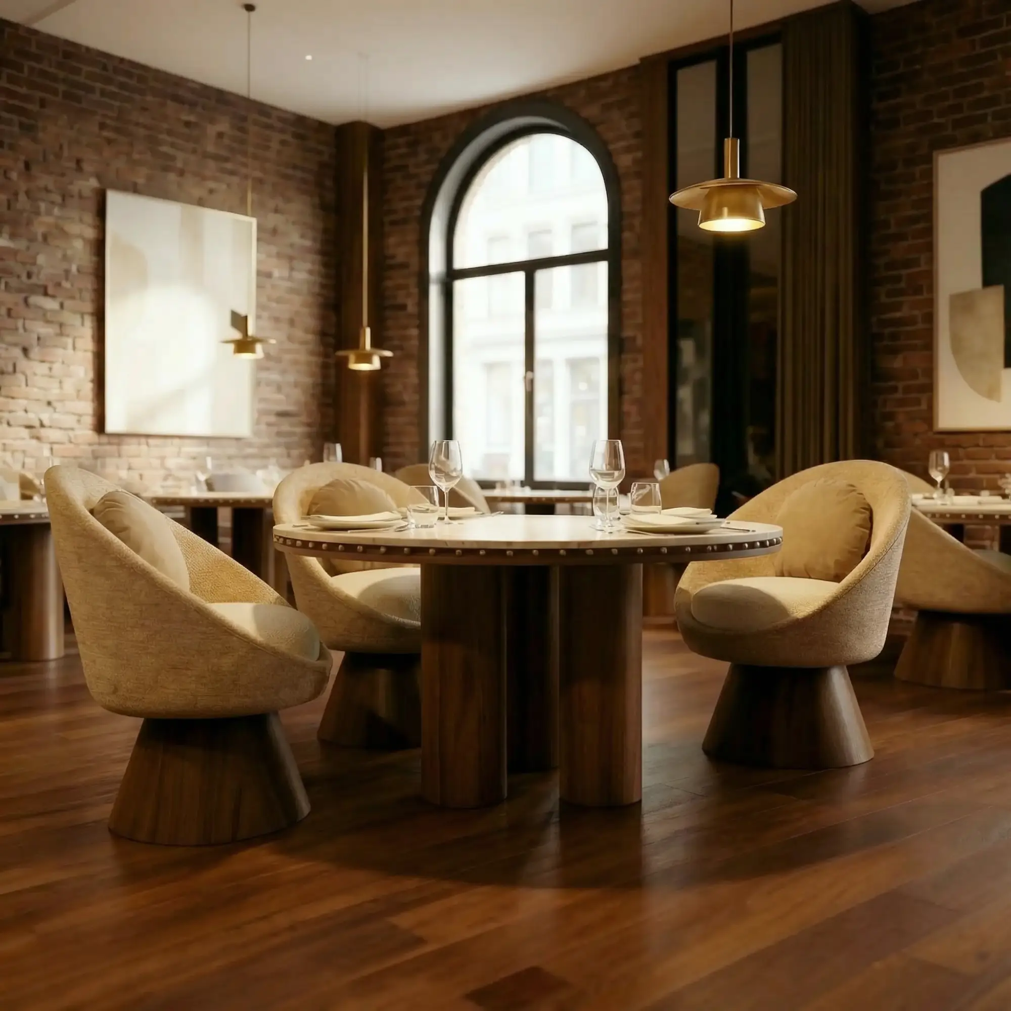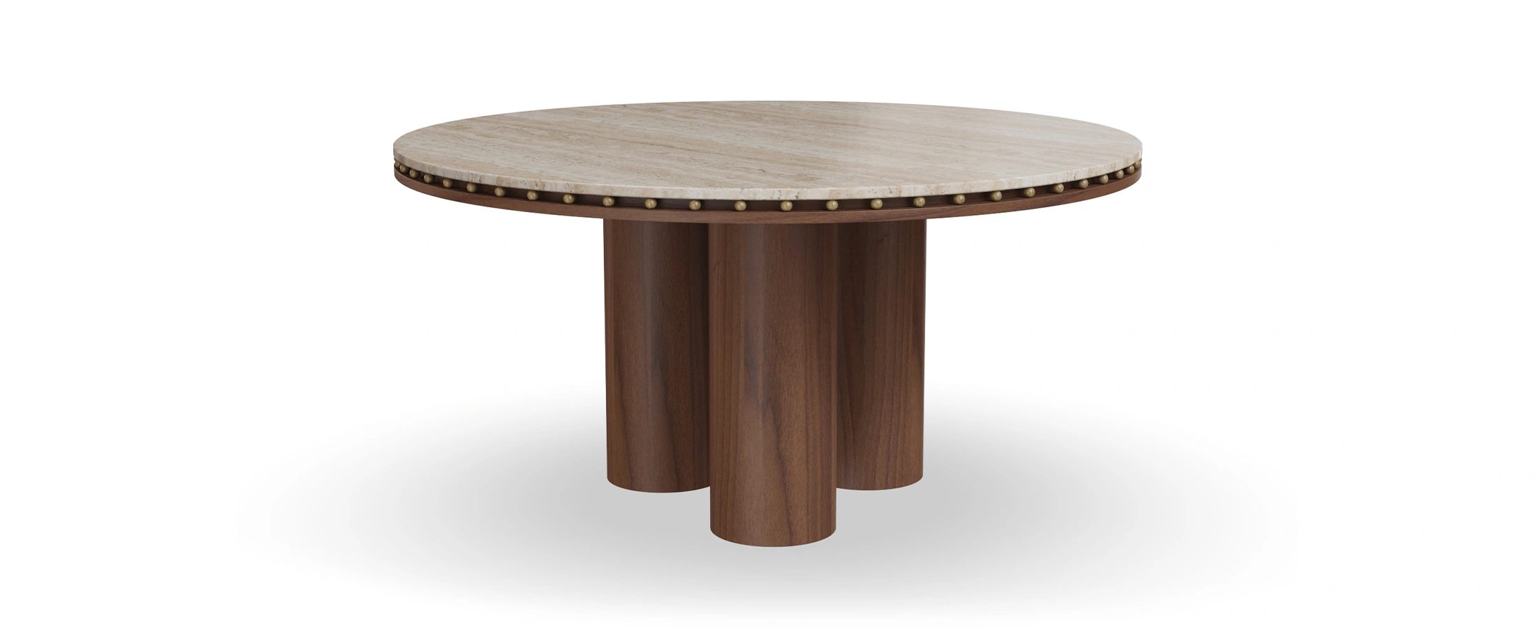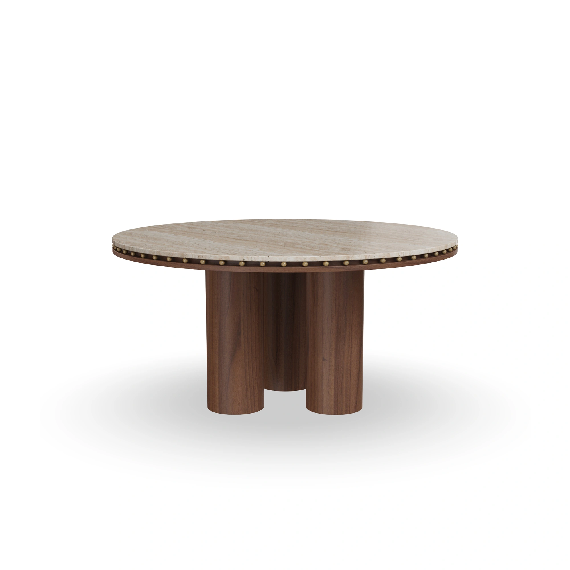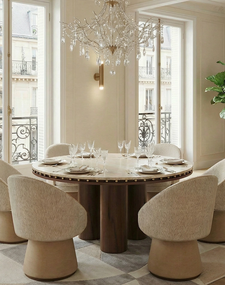 The Roselle Dining Table brings sculptural presence and refined materiality into perfect balance. Its circular stone top is framed by a line of brass studs, adding a delicate rhythm that highlights the table’s organic warmth. Below, a fluted walnut pedestal provides architectural texture and a sense of grounded elegance.