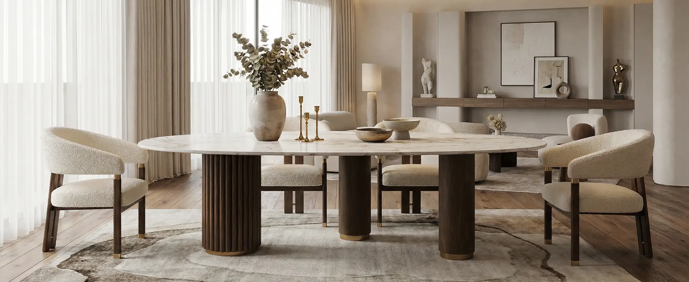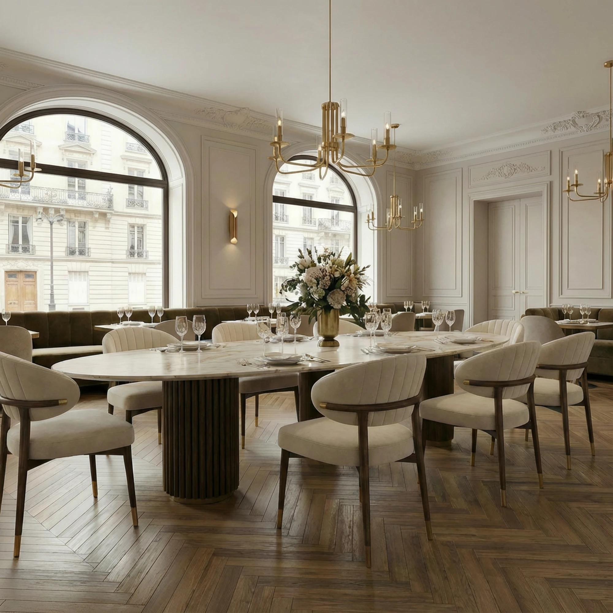 Élodie Dining Table is a sculptural marble dining table, conceived as a calm architectural presence that anchors dining areas with measured proportion. Its oval form balances elegance and circulation, reading refined from every angle.