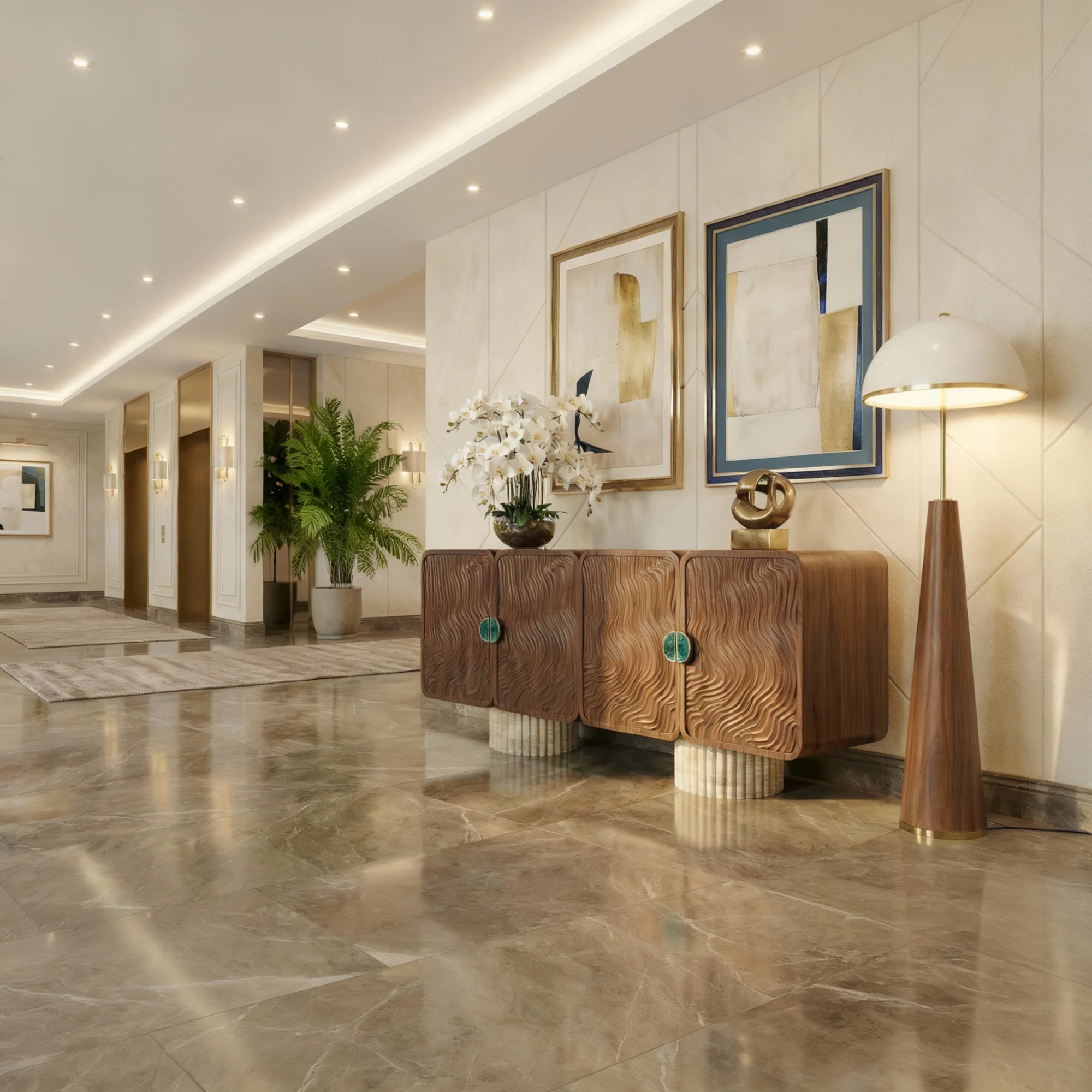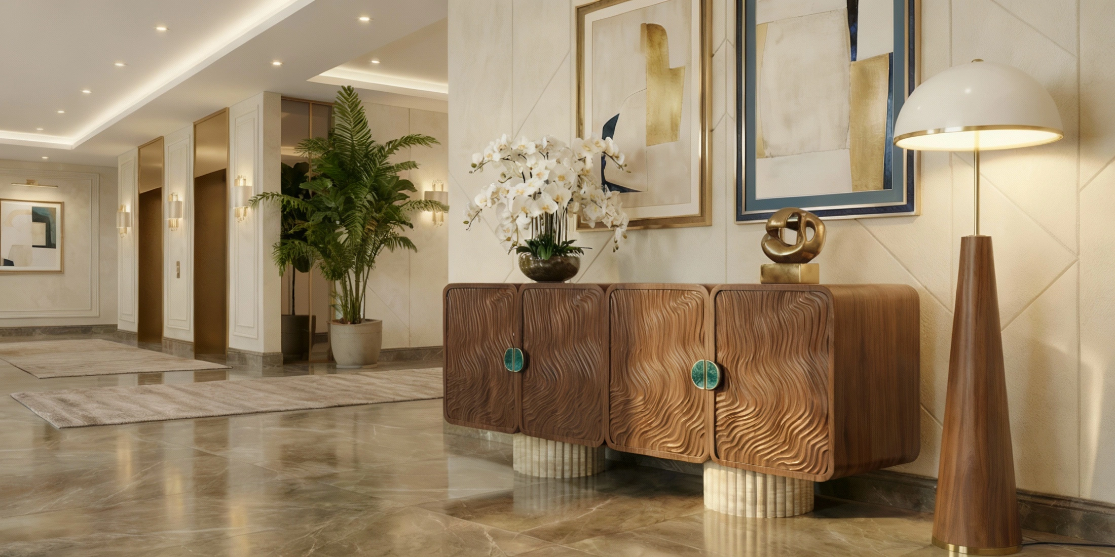 Its scale suits a designer storage console in walnut and natural stone, offering generous, concealed storage while maintaining a disciplined exterior. The result is a designer storage cabinet with textured doors that reads refined and materially expressive.