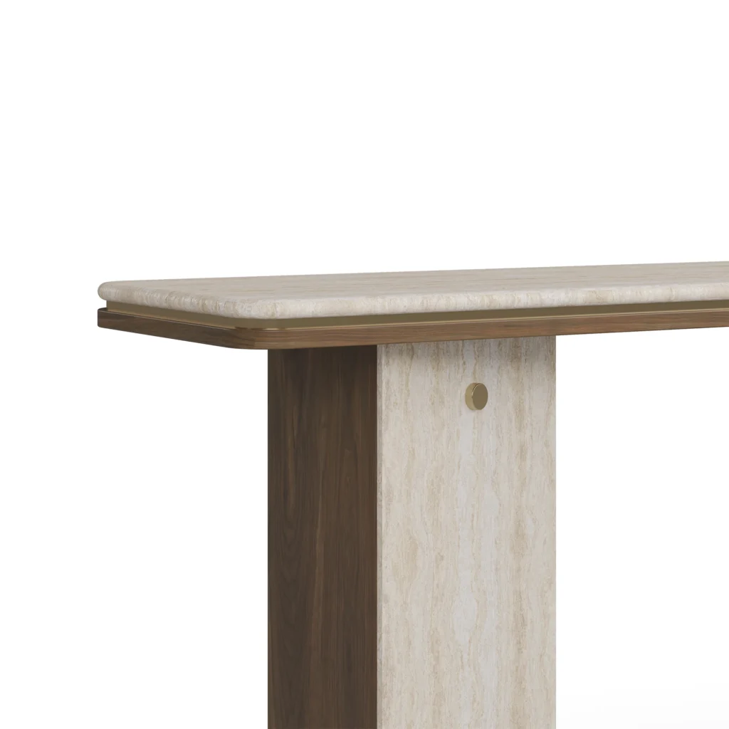 Its sleek travertine top is complemented by robust legs, featuring a mix of travertine and walnut for a striking contrast.