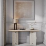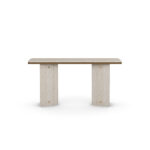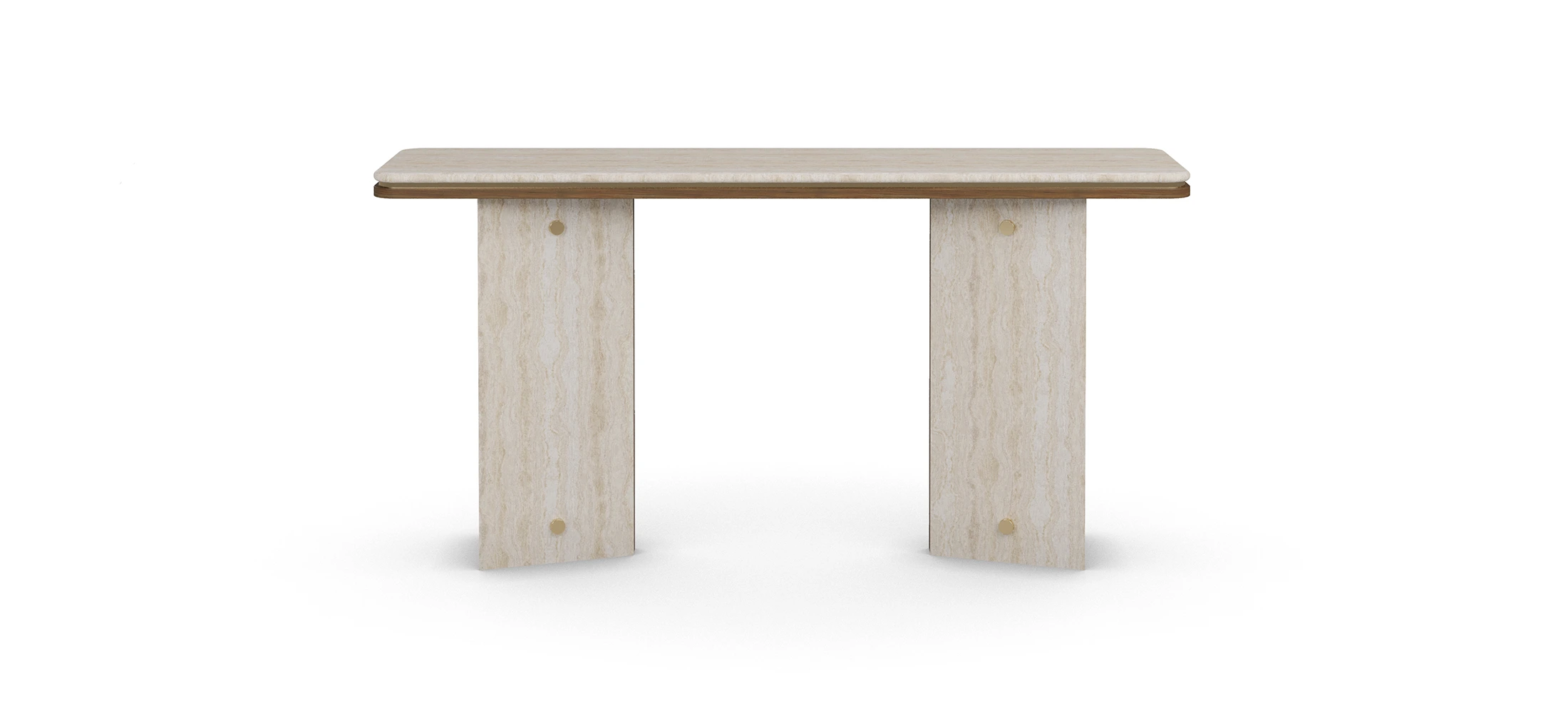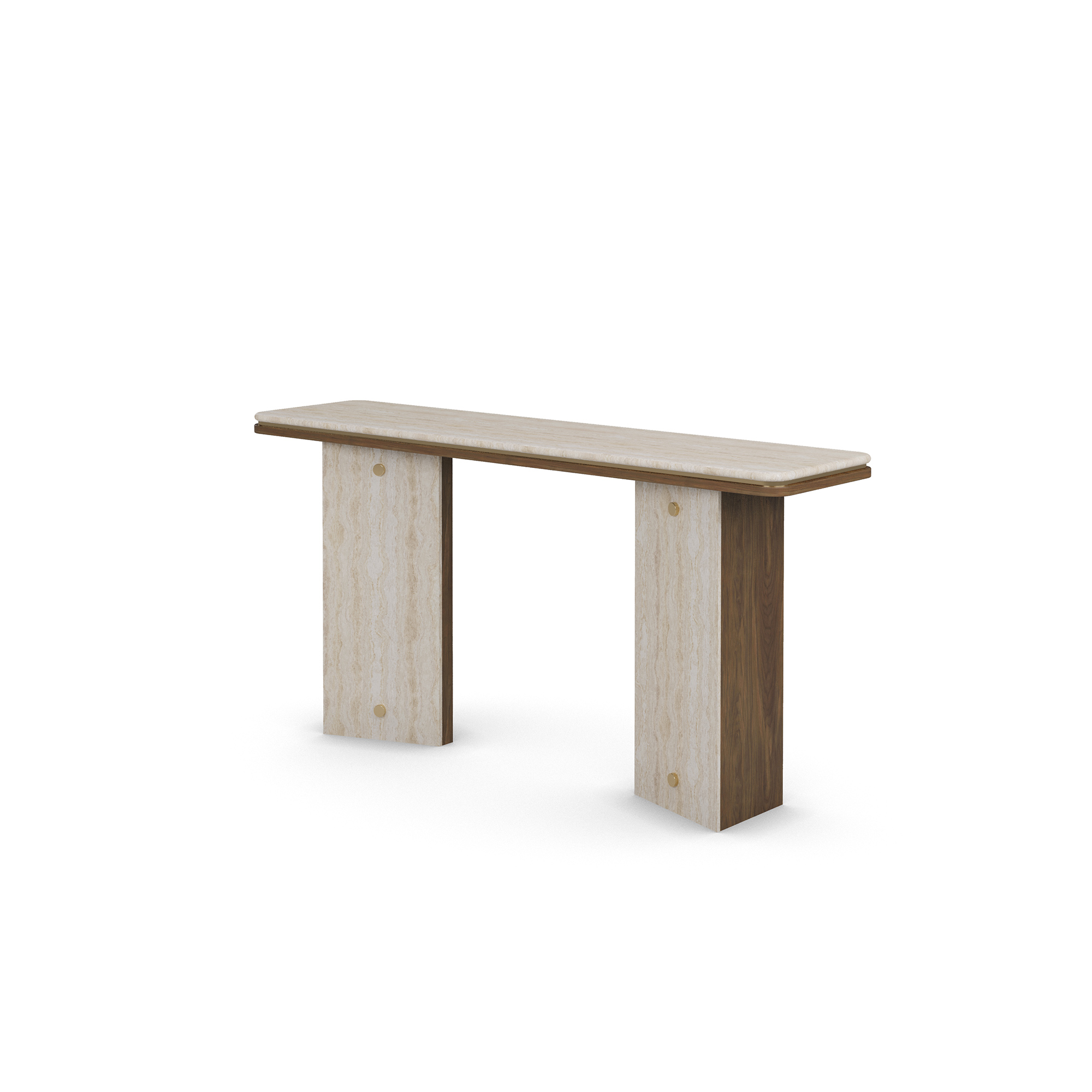 Its sleek travertine top is complemented by robust legs, featuring a mix of travertine and walnut for a striking contrast.