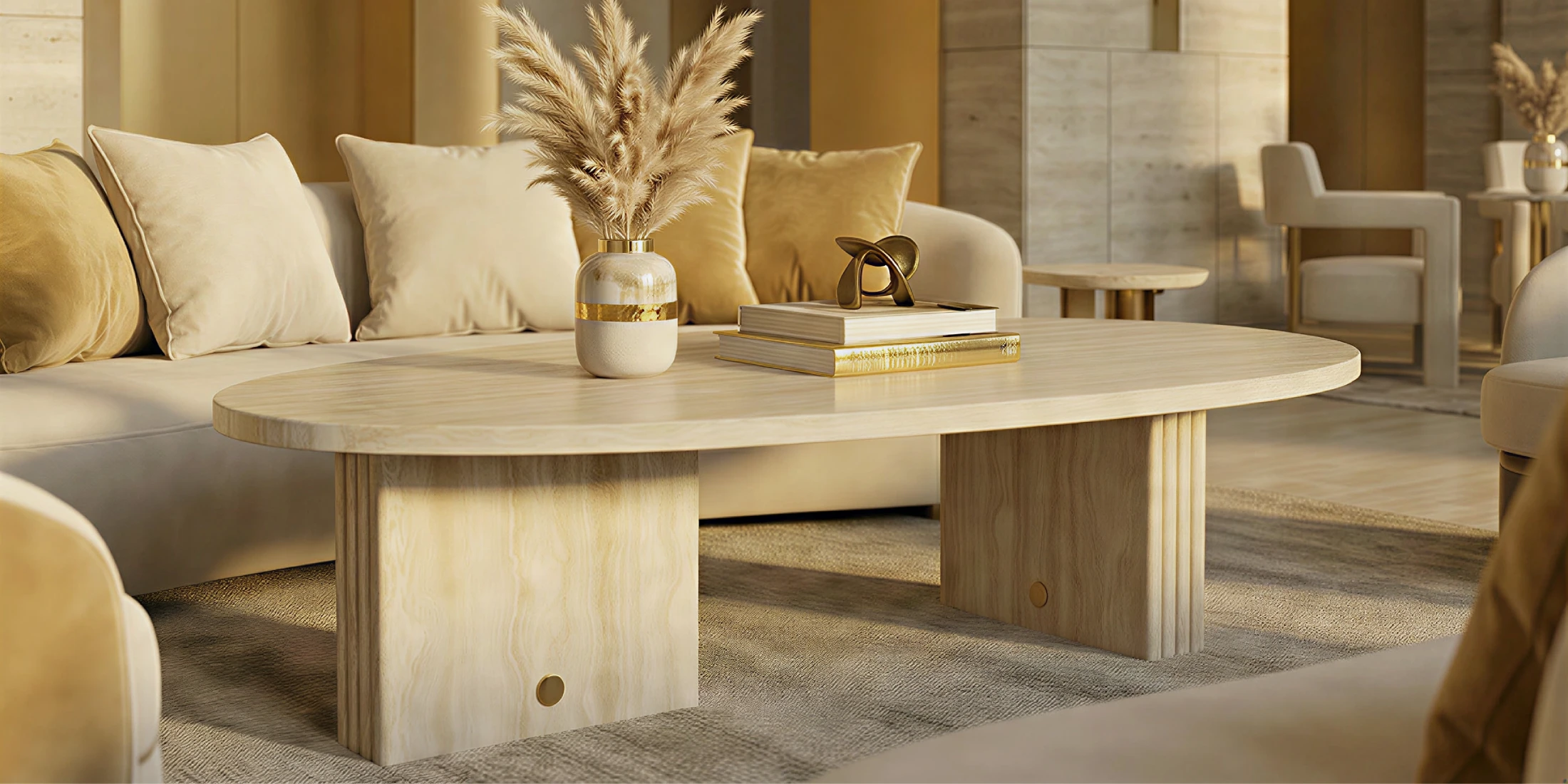 Landi Coffee Table is a luxury travertine coffee, conceived as an oval sculptural volume that anchors seating areas with quiet authority. Its geometry balances presence and spatial flow.