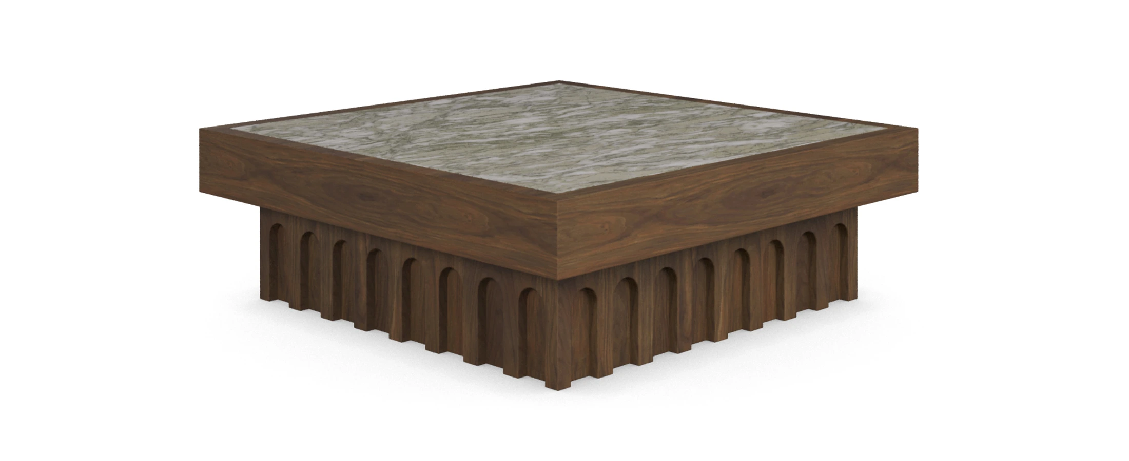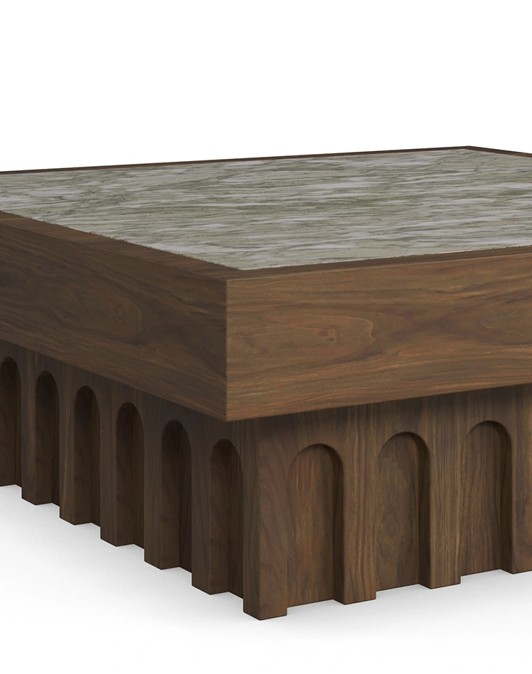 The top is crafted from premium Persian Green marble, celebrated for its refined texture and unique veining, framed by a thick walnut border for a bold, grounded presence.