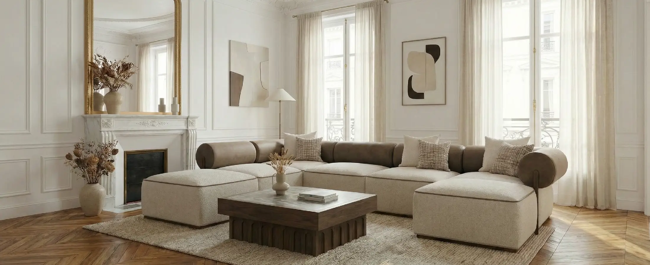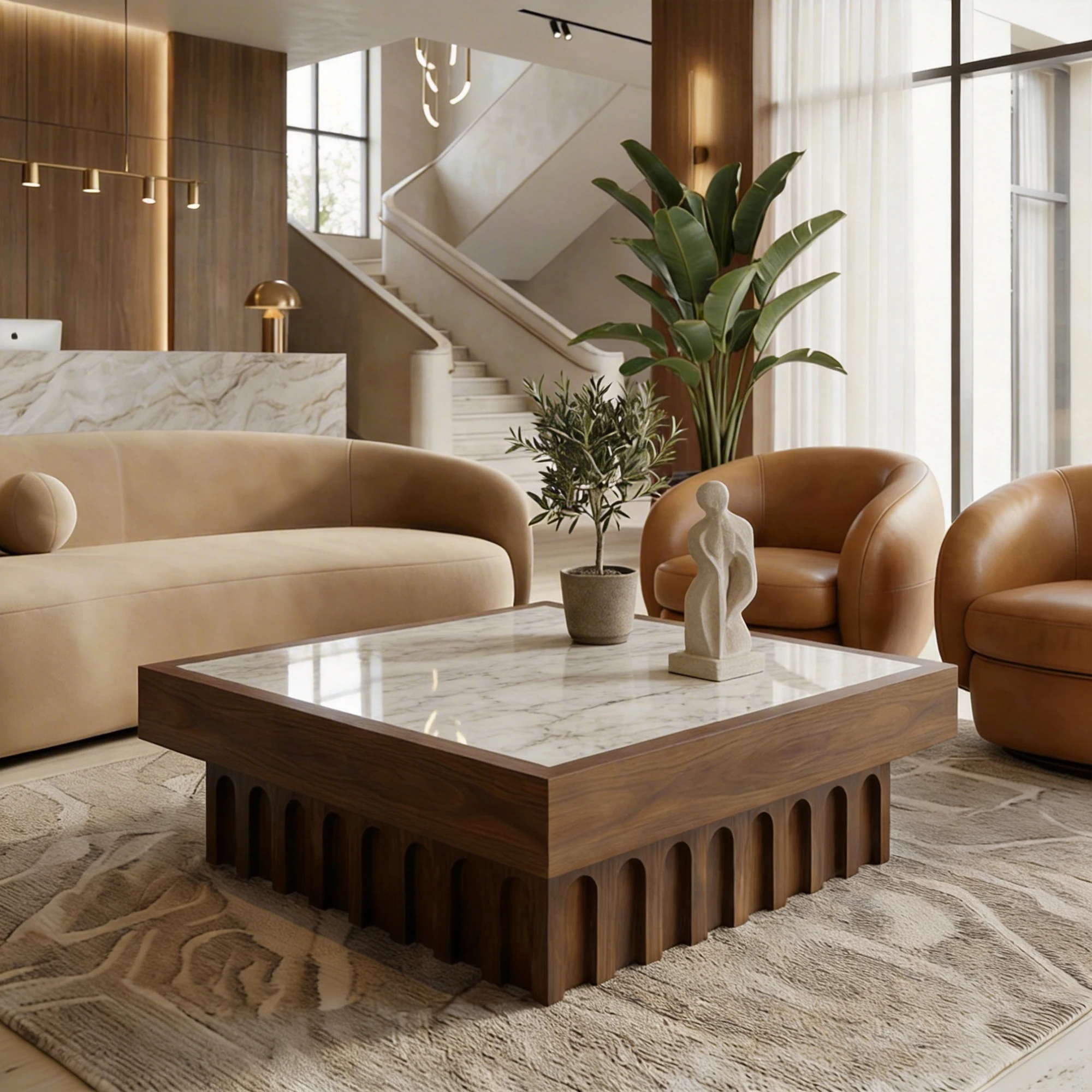 Its profile supports a handcrafted centerpiece in stone, offering visual and tactile depth. The result is a sculptural marble table that reads elegant and restrained.