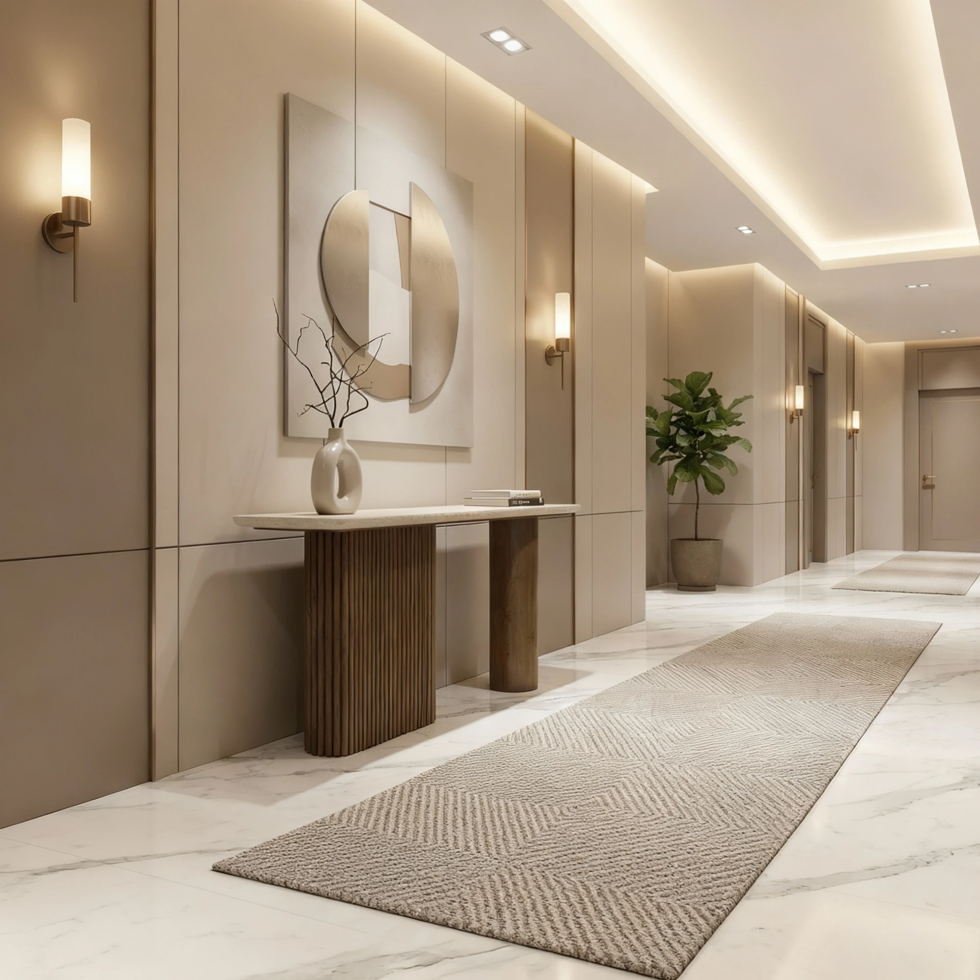 The piece is realised as a designer console with ribbed and cylindrical wood legs, where smooth travertine meets warm wood accents. Each junction is refined, letting materials articulate rhythm without ornament.