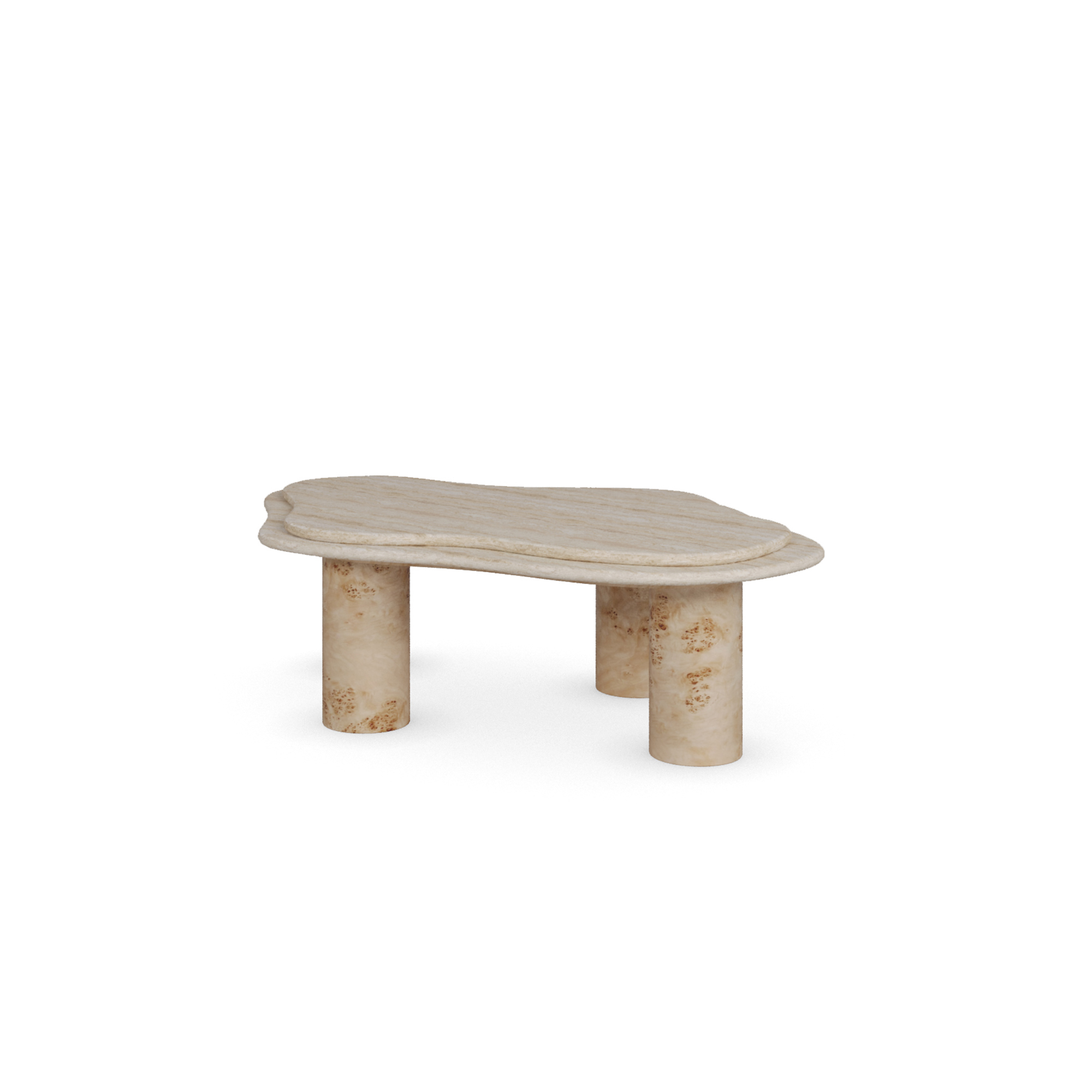 Maelis Coffee Table presents a poised, organic form poplar root coffee table, composed to balance sculpture with use. Two gently offset travertine planes read as layered strata, their soft edges and natural veining introducing movement against four cylindrical legs in richly figured poplar root. The meeting of stone and timber is carefully resolved with discreet joinery and a light reveal, keeping the profile grounded yet visually calm. A sculptural profile with layered stone surfaces becomes a handcrafted centerpiece in natural materials, inviting touch and close inspection. Scaled for contemporary living spaces, Maelis anchors a seating arrangement without noise, offering generous surface and quiet character.