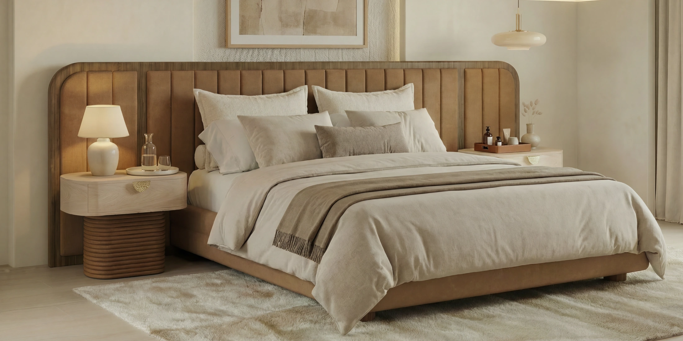 Pair with Gilda Bench to extend timber and upholstery textures across the bedroom composition.