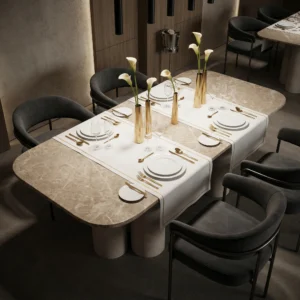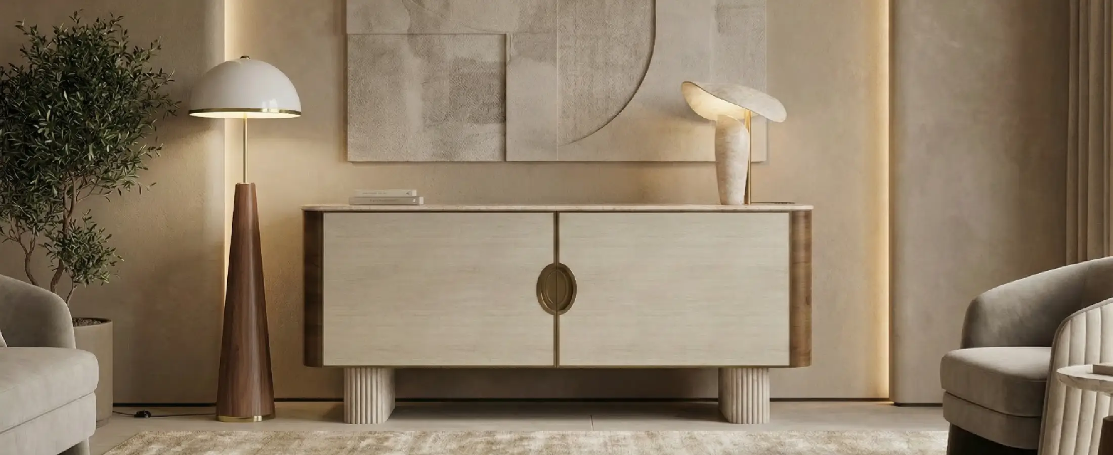 Its profile suits a handcrafted buffet with travertine legs and stone top, offering tactile depth and composure.