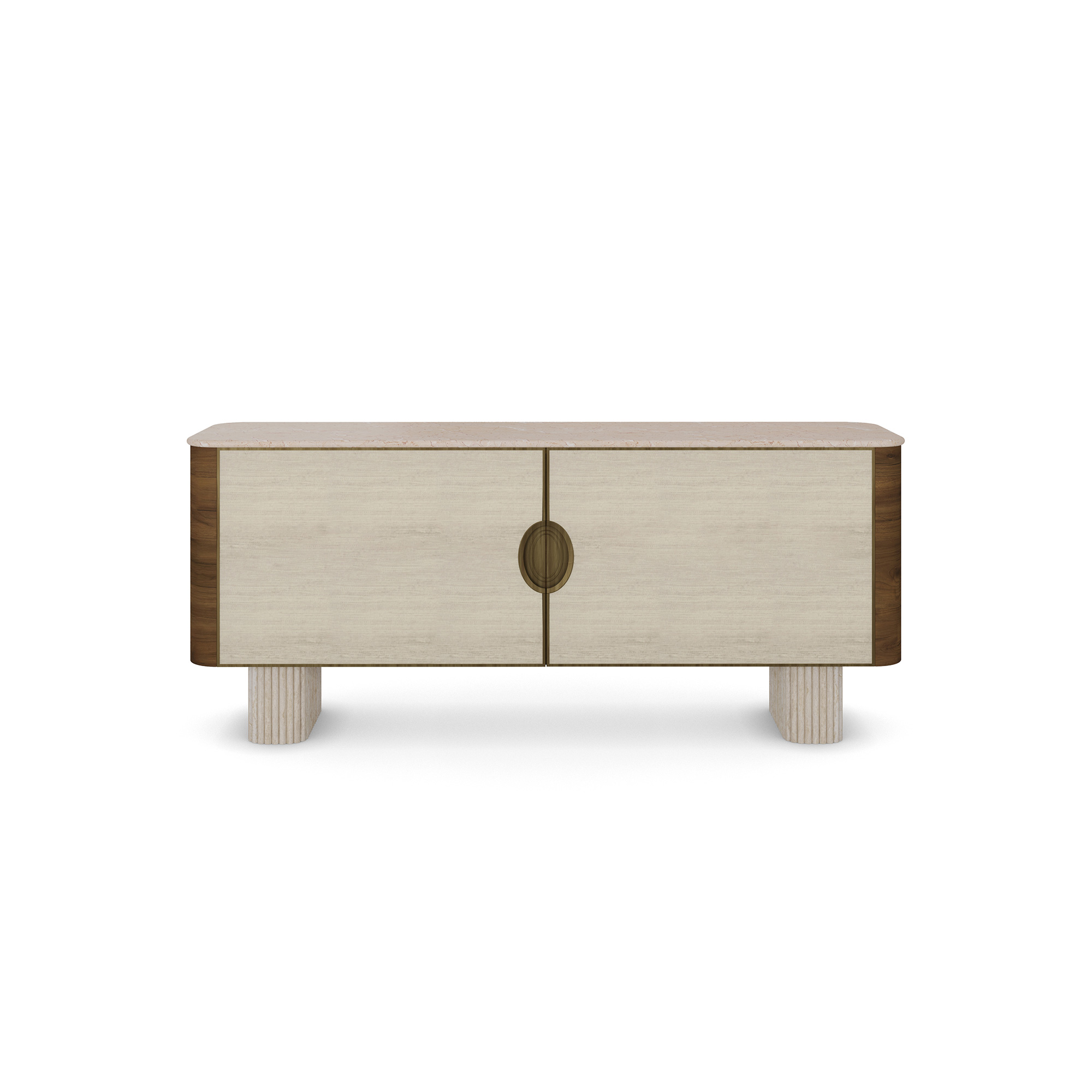 The Perrine sideboard blends natural elegance and modern design, featuring ribbed travertine legs, walnut veneer, an Alpinina marble top, and vintage-inspired brass details—perfect for any sophisticated space.