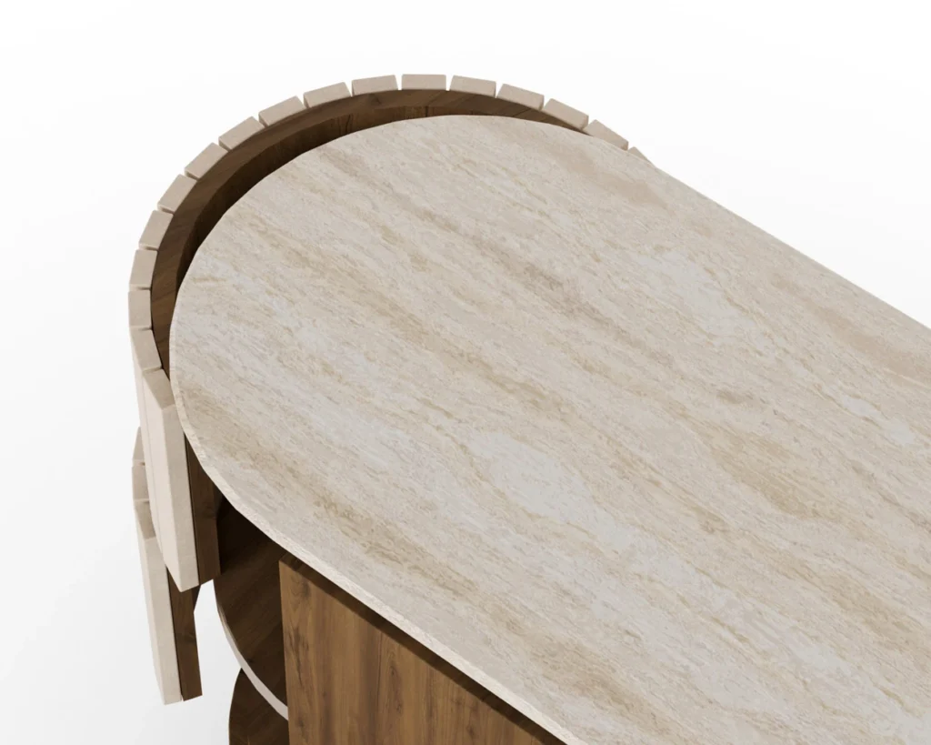 Peter Sideboard introduces a luxury walnut and travertine sideboard defined by calm proportion and tactile contrast. A honed travertine slab sits with measured precision over a walnut body that traces rounded lines and softened edges, the junctions resolved with crisp reveals and discreet joinery. Velvet-clad sides add a gentle sheen and a soft, curved profile, tempering the stone’s solidity while deepening the palette. Three columnar legs lift the volume with clarity, keeping the silhouette poised and modern. Inside, adjustable storage supports service and display without visual noise. Scaled for dining rooms or generous living spaces, it reads as a designer buffet in natural materials with a refined stone surface, expressing Nolita Harbour’s commitment to craft, proportion, and enduring form.