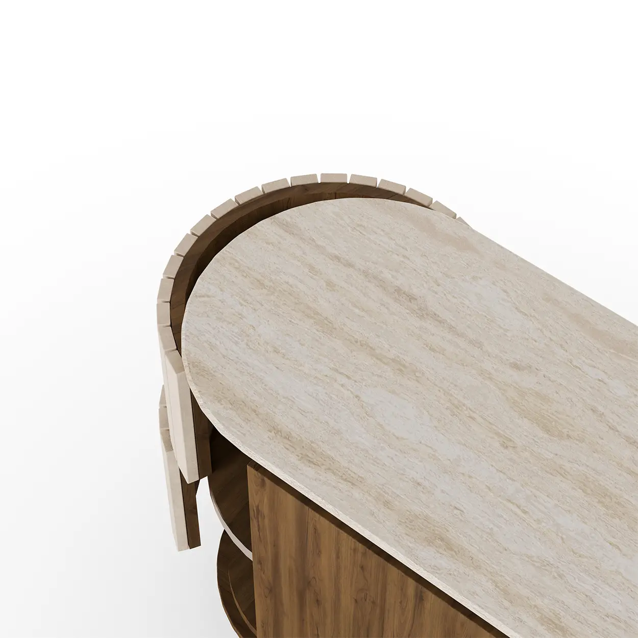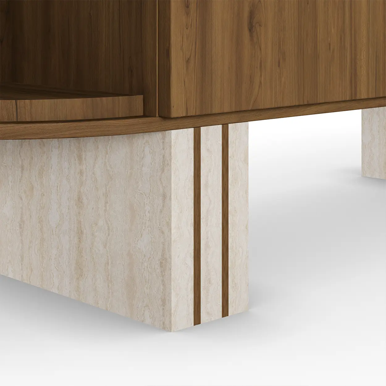 Peter Sideboard introduces a luxury walnut and travertine sideboard defined by calm proportion and tactile contrast. A honed travertine slab sits with measured precision over a walnut body that traces rounded lines and softened edges, the junctions resolved with crisp reveals and discreet joinery. Velvet-clad sides add a gentle sheen and a soft, curved profile, tempering the stone’s solidity while deepening the palette. Three columnar legs lift the volume with clarity, keeping the silhouette poised and modern. Inside, adjustable storage supports service and display without visual noise. Scaled for dining rooms or generous living spaces, it reads as a designer buffet in natural materials with a refined stone surface, expressing Nolita Harbour’s commitment to craft, proportion, and enduring form.