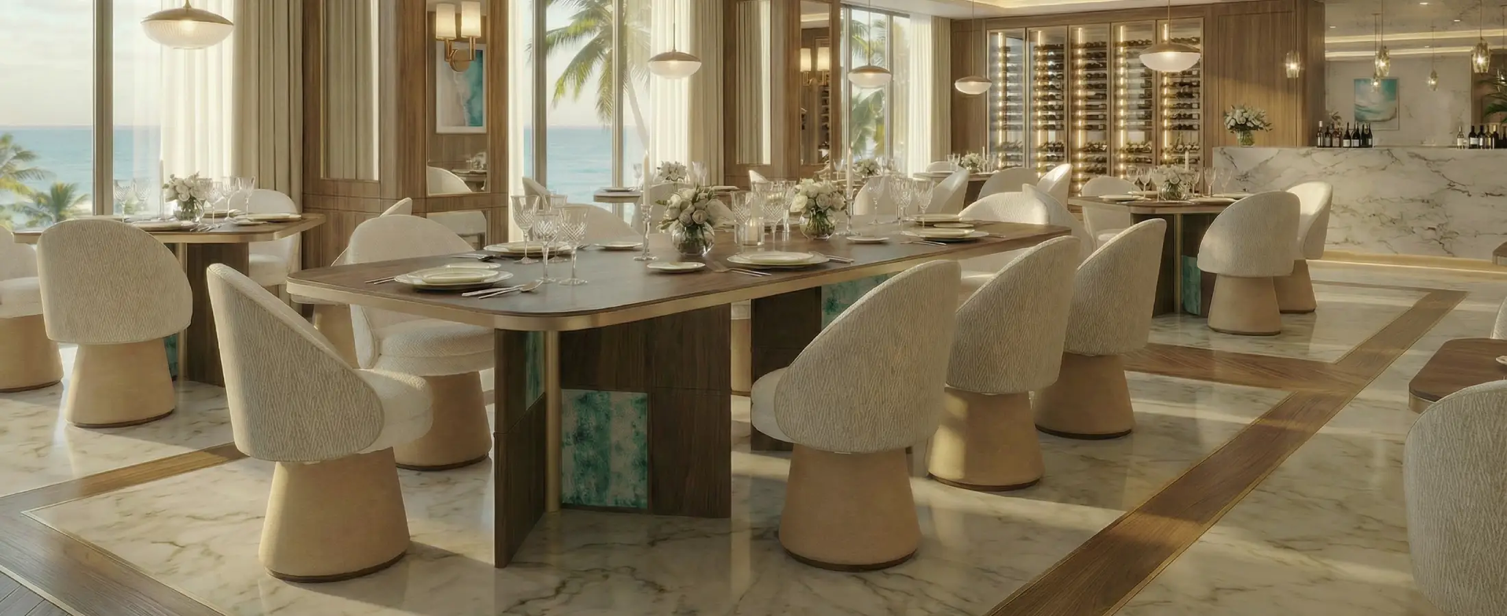 The geometry encourages sociable comfort; the surface feels warm to the hand and sits with a composed presence, giving a sense of order and quiet ceremony to the dining plan.