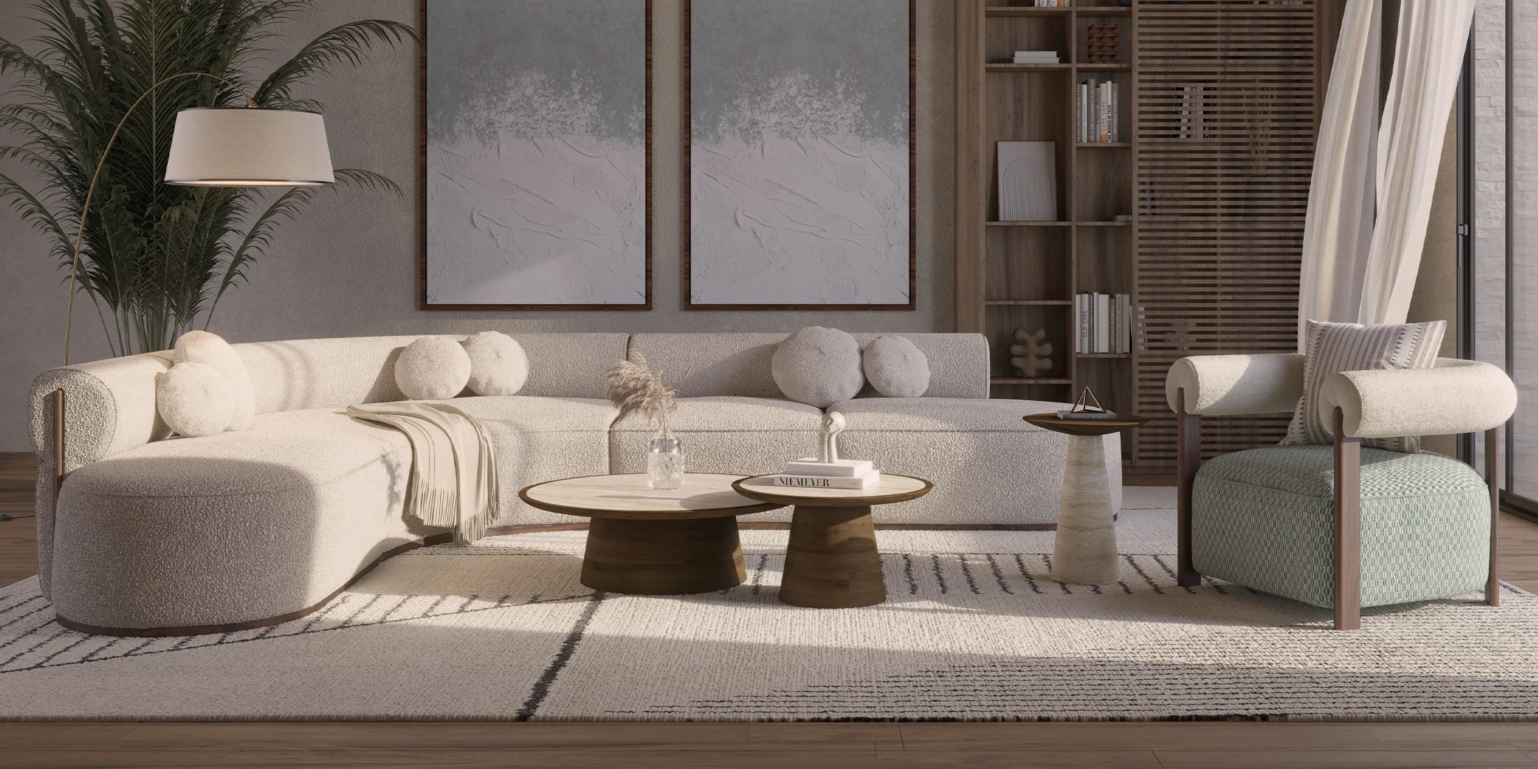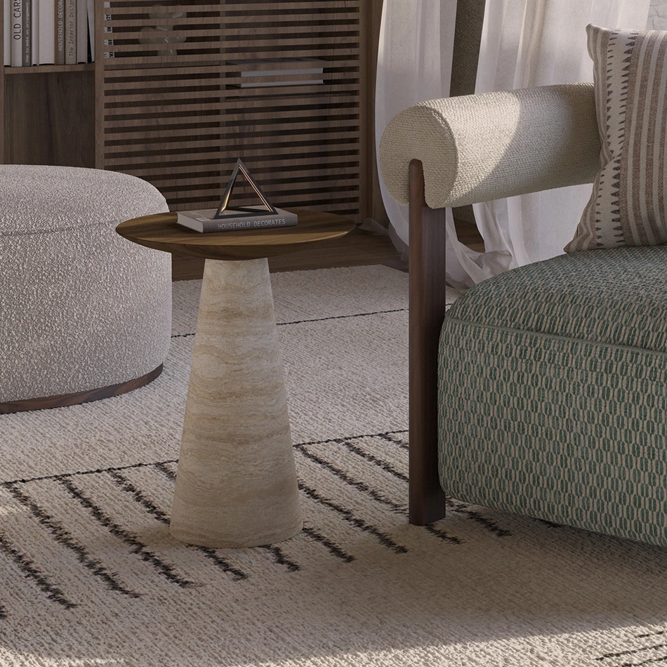 The Lotte Side Table balances rich walnut with a travertine base, offering natural warmth and contrast.