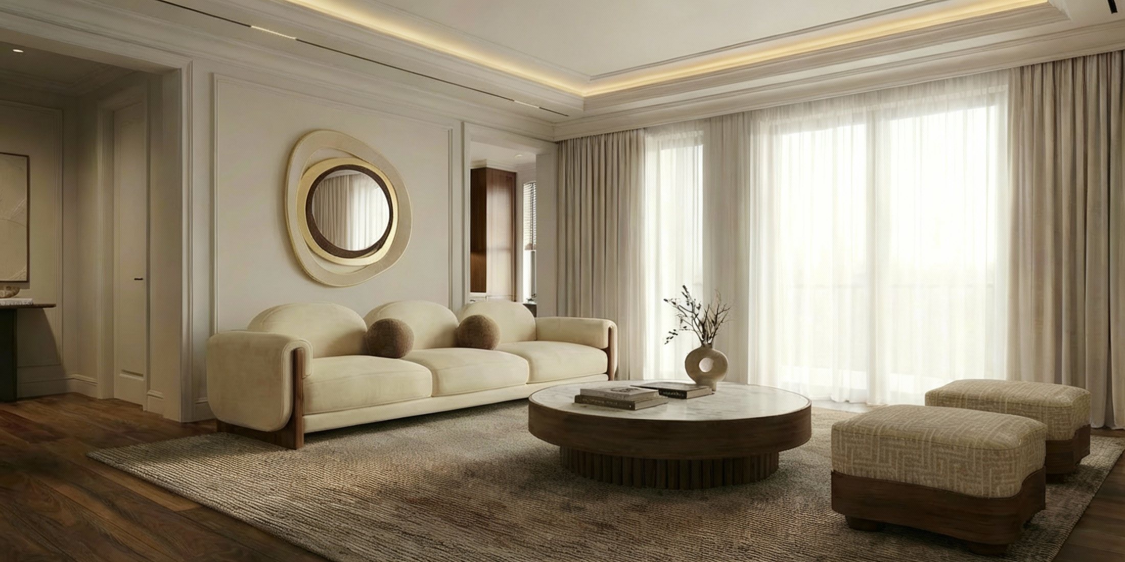 A continuous organic frame in solid wood wraps the mirror in asymmetric curves, interrupted by discreet metal detailing that clarifies the edge. Each contour is hand-finished, so the transitions between grain and metal read with precision.