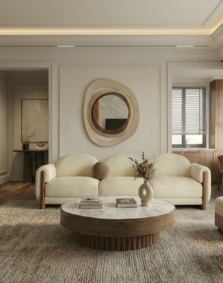 The clear glass holds a calm reflection, while the mirror’s sculptural profile and tactile texture catch light in soft shifts across the wall. It works comfortably in living rooms, entry spaces, or suites where form and material carry more weight than ornament.
