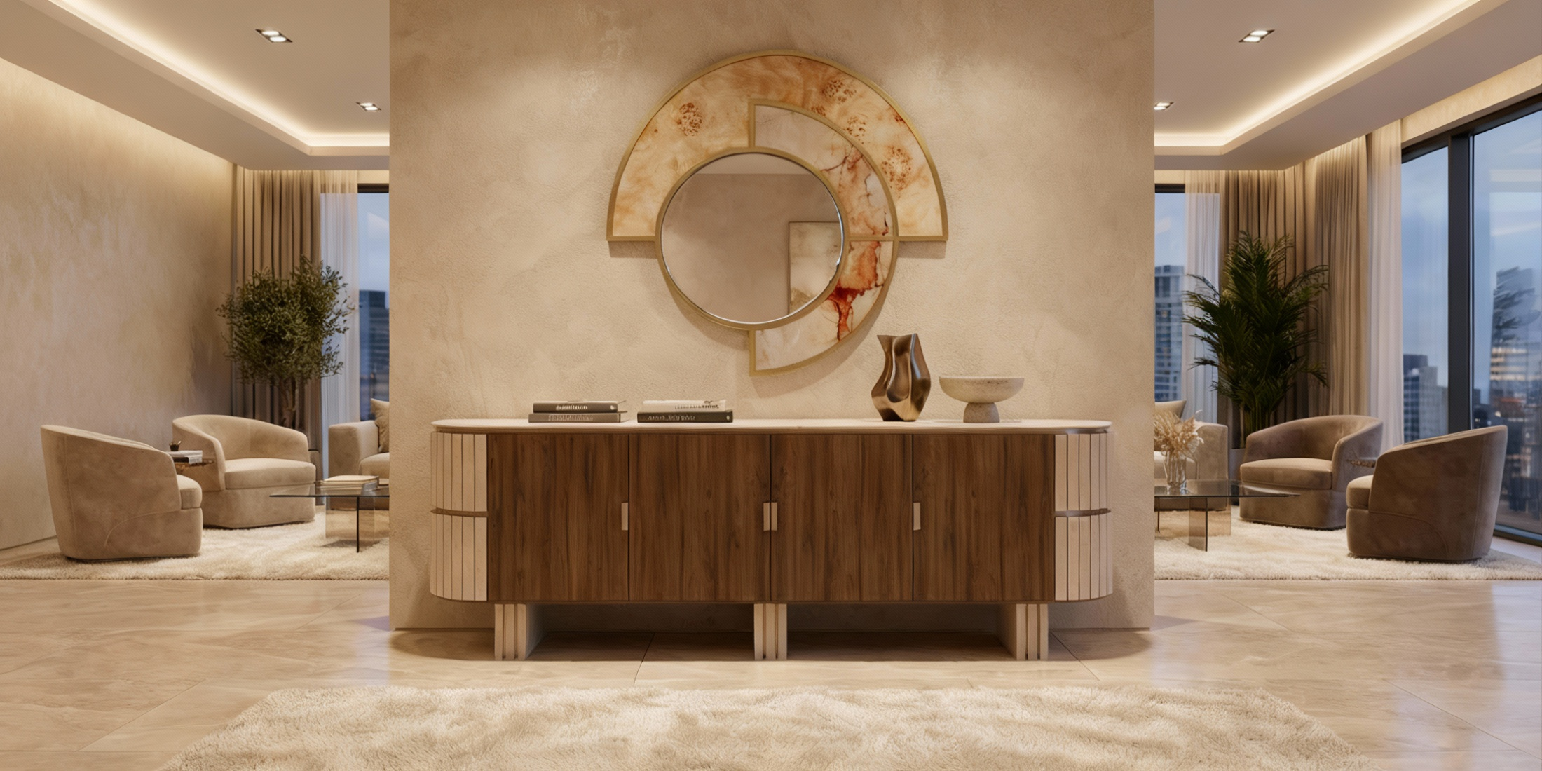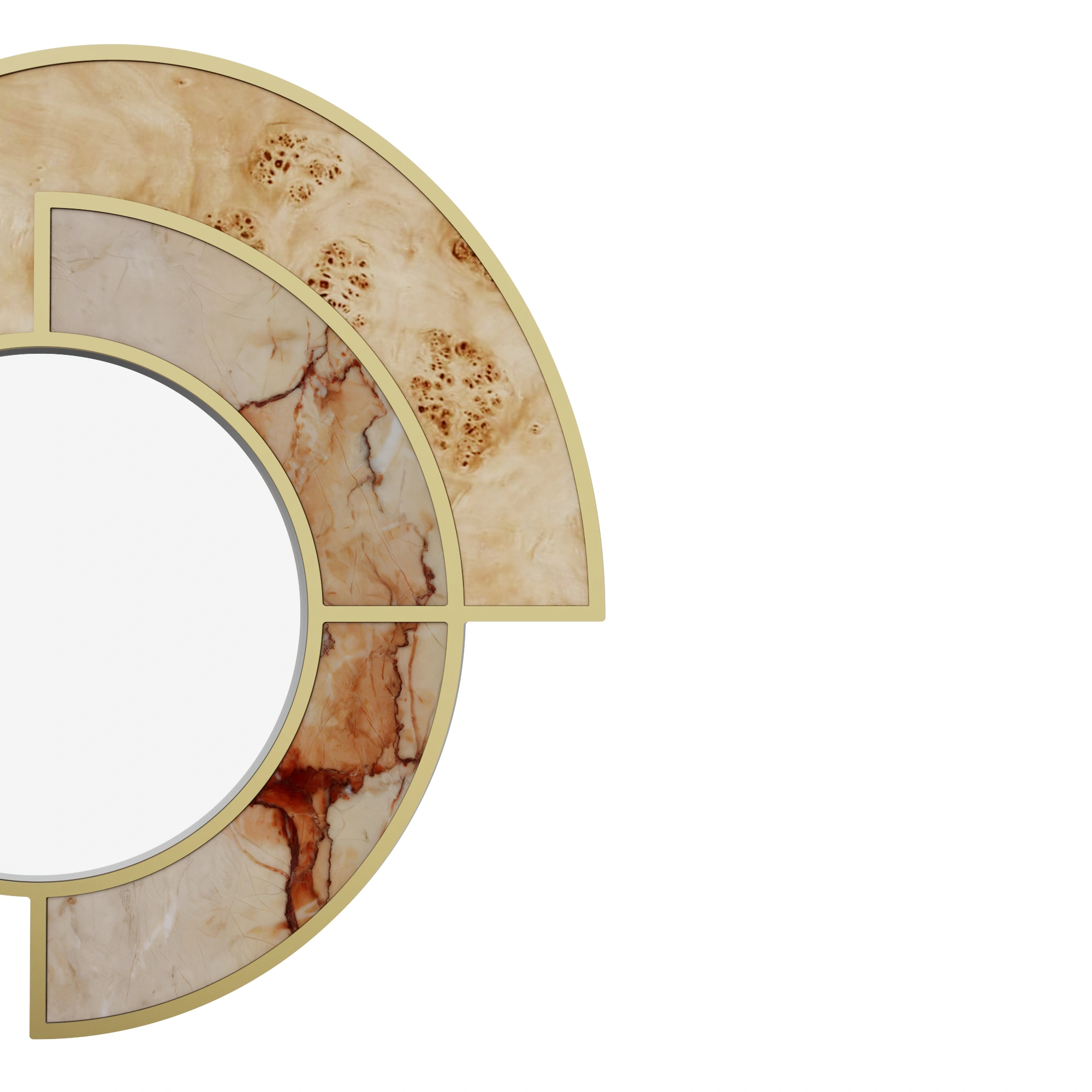 A rhythm of panels in poplar root burl and Aegean Rose marble sets up a dialogue between warm grain and cool stone. Fine lines of polished brass trace the joints, clarifying each segment of the architectural frame and keeping the outline precise.