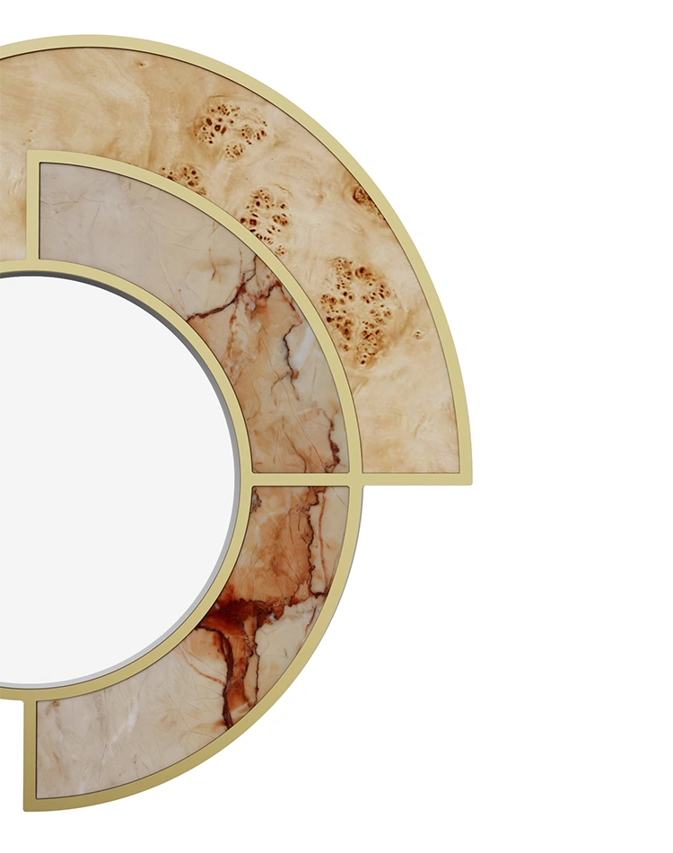 The distinctive feature of the Sierra Mirror is its sculptural mix of burl wood, marble inlays, and brass accents, creating a layered frame that blends elegance and functionality in one striking piece.