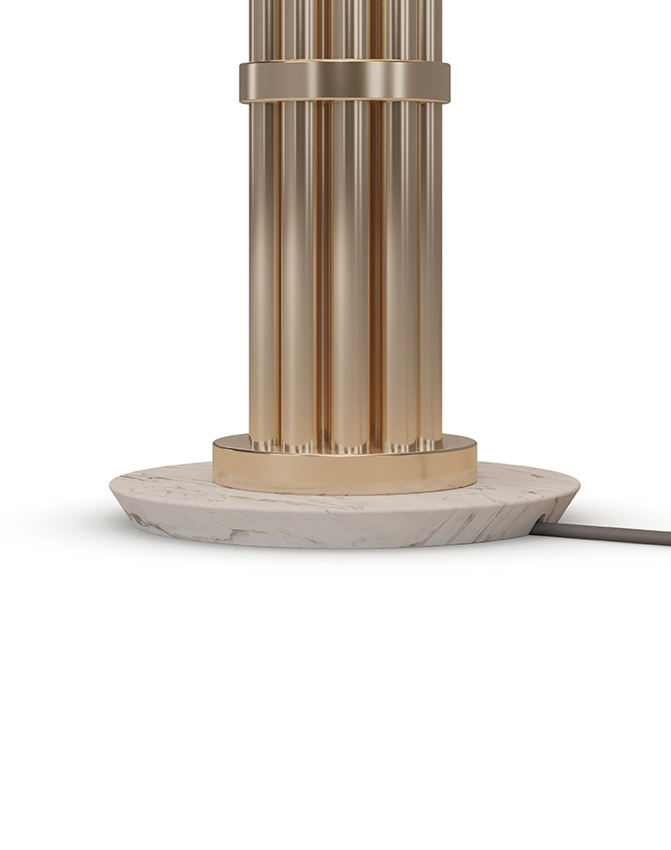 a series of gold-plated metal rods form a structured column, creating a captivating balance of strength and sophistication