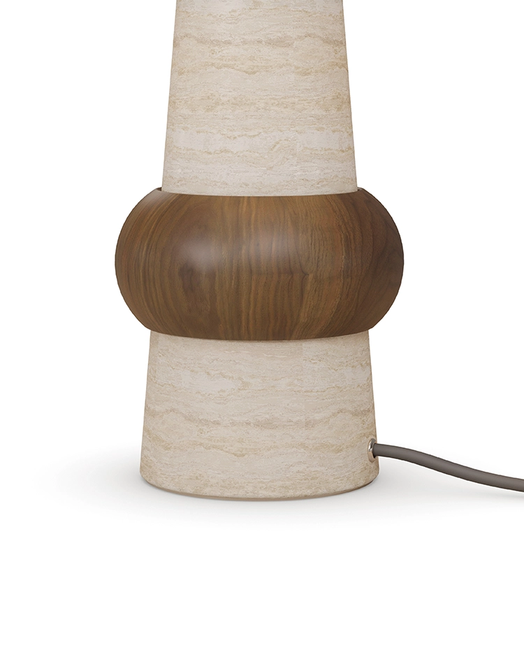 The softly rounded walnut elements add depth and contrast, enhancing the lamp’s artistic form.