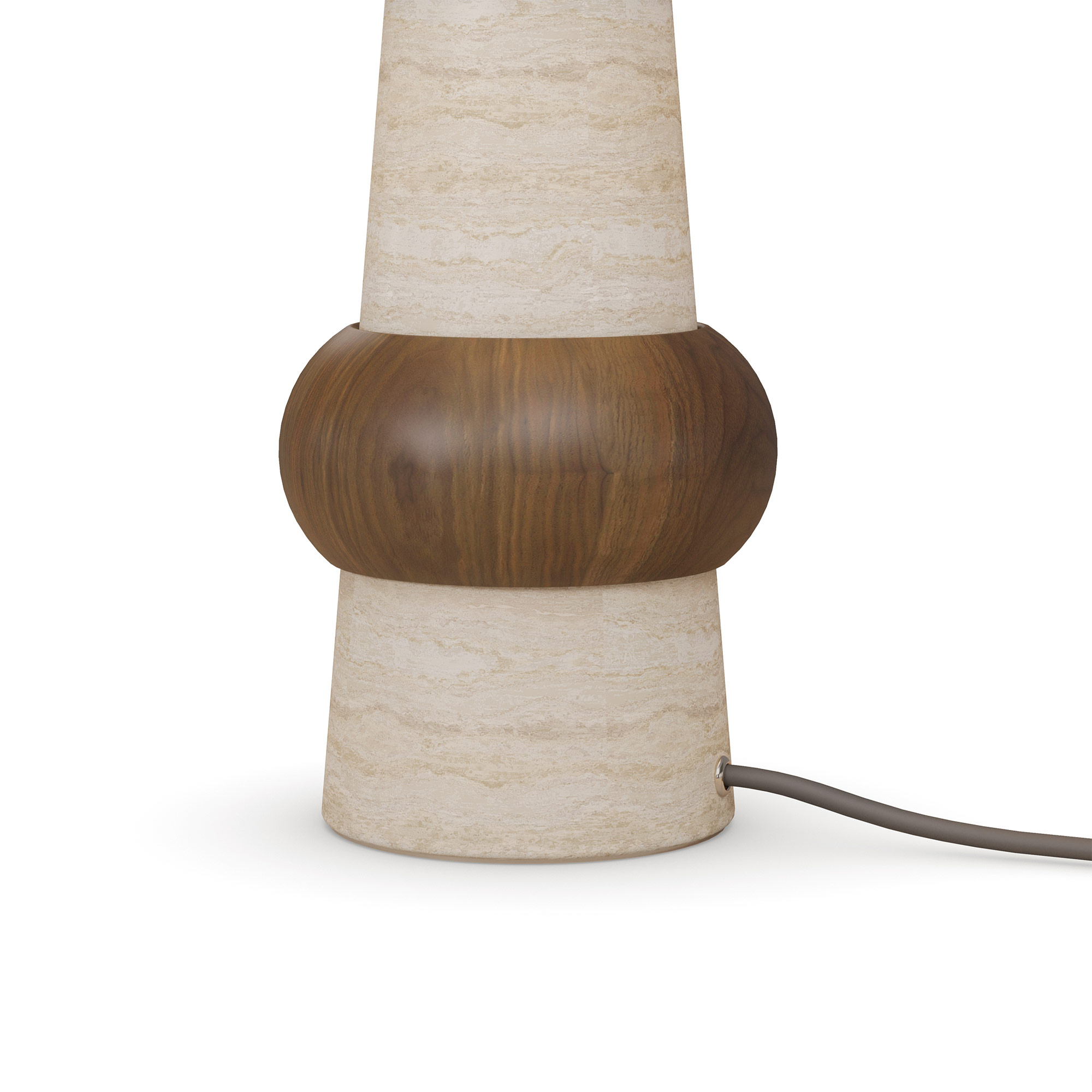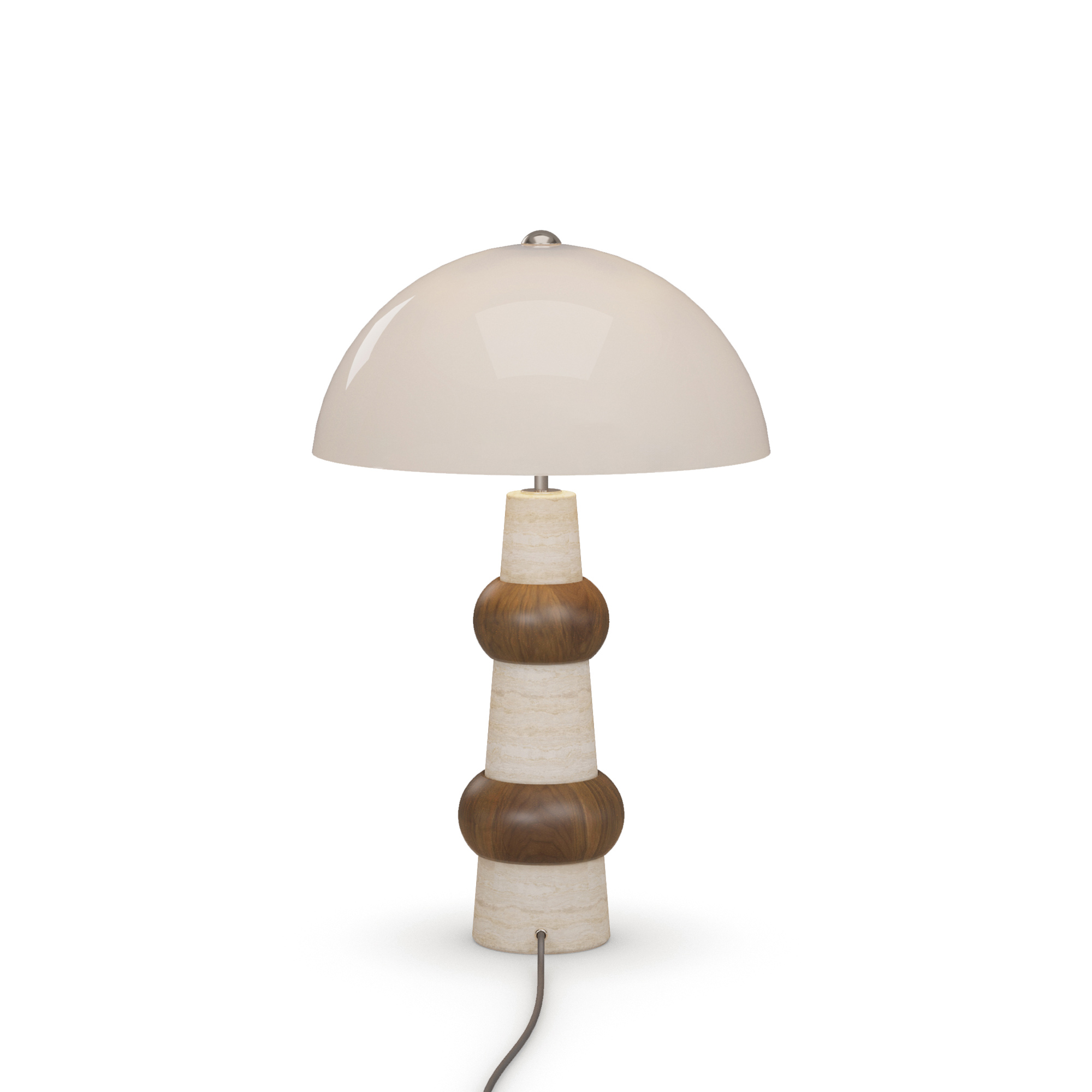 The softly rounded walnut elements add depth and contrast, enhancing the lamp’s artistic form.