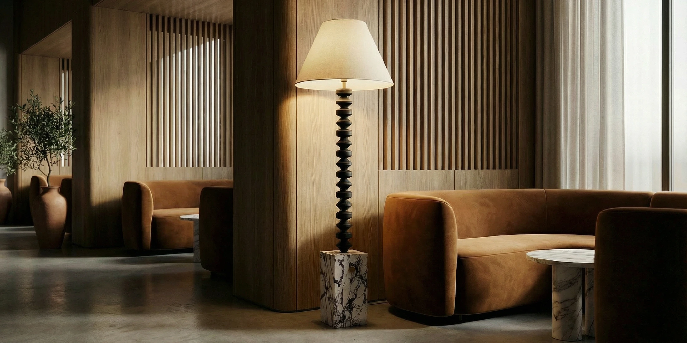 Above, a fabric shade softens the vertical line and diffuses illumination into a quiet glow. The lamp balances sculptural clarity with comfort, working beside seating, in suites, or as a solitary marker in a lounge.