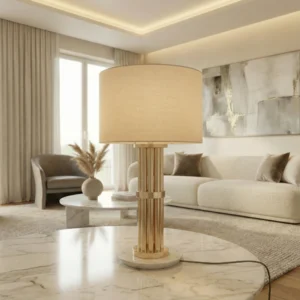 The Gustav Table Lamp is a travertine and walnut table lamp conceived as a compact architectural object for consoles, bedside surfaces, and shelving. Its stance is calm and deliberate, defined by volume, rhythm, and material contrast.
