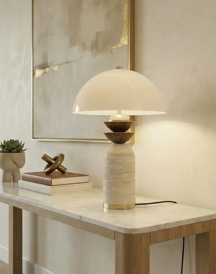 Light settles through the dome into a soft ambient glow, grazing the stone and timber before diffusing into the room. The lamp’s sculptural profile holds presence at close range yet leaves surrounding surfaces quiet and usable.