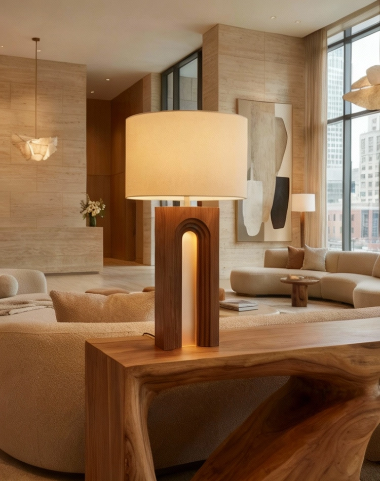 The Louis Table Lamp is a walnut table lamp with fabric shade conceived as a quiet sculptural accent for bedside and console settings. Its outline is calm and deliberate, defined by proportion and material rather than ornament.