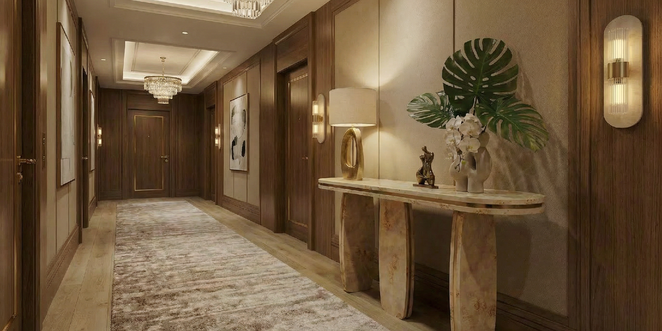 Light moves through the glass into a soft ambient glow, washing the stone and then the wall around it. The lamp’s sculptural profile works in repetition along a corridor or as a pair beside artwork, a bed, or a dining composition.
