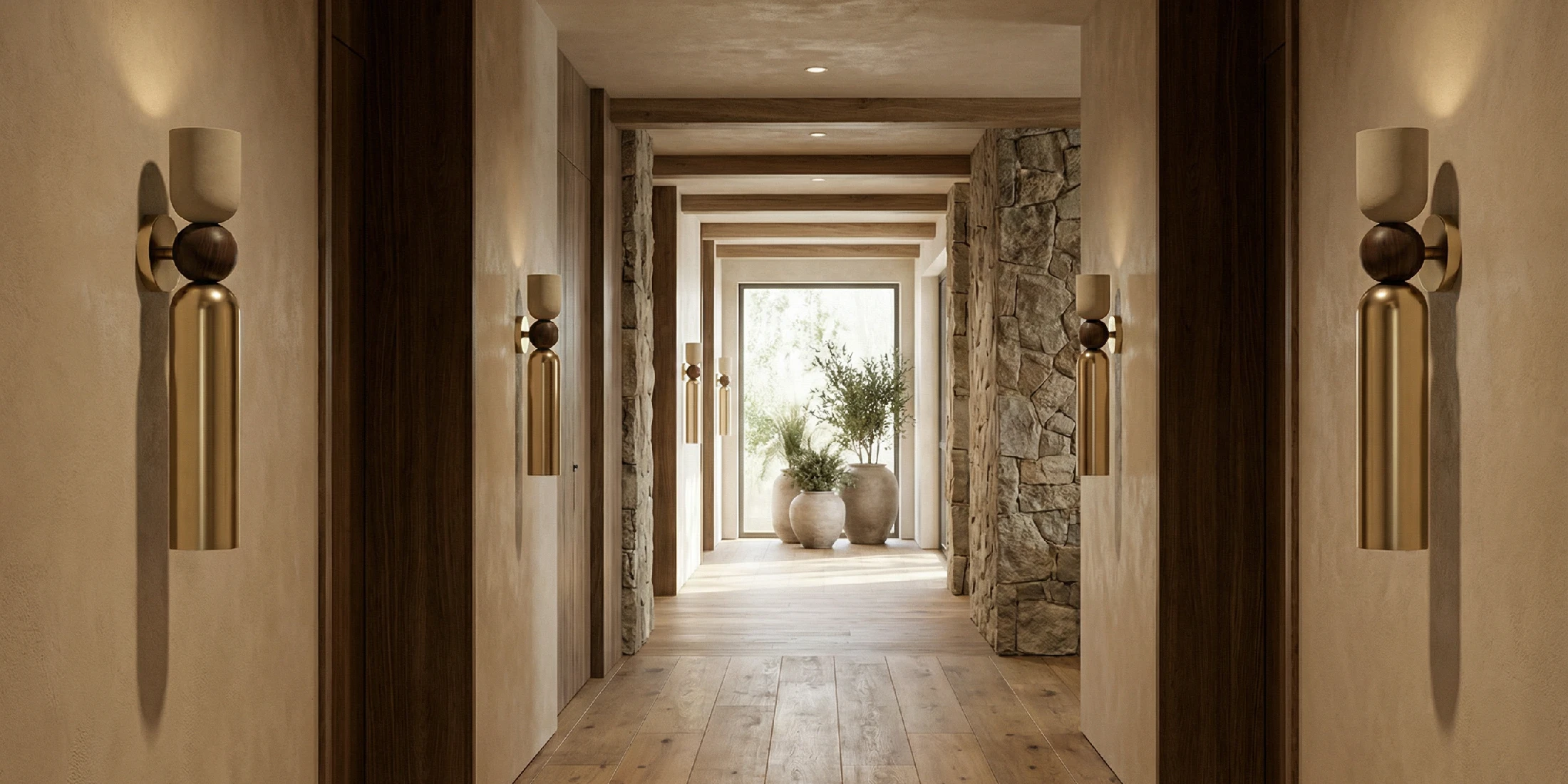 Illumination is filtered through the shade into a warm glow that grazes the wall and settles softly into the room. The piece works in sequence along corridors or as a pair above consoles and headboards, adding natural accents without crowding the architecture.