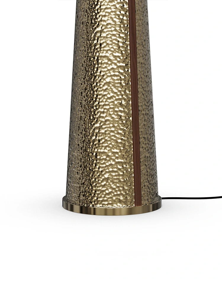 Its tapered conical base, crafted from hammered brass, showcases a rich, textured surface that catches and reflects light beautifully.