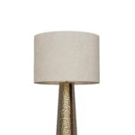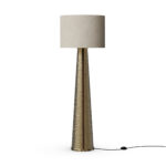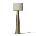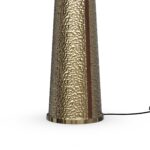 Its tapered conical base, crafted from hammered brass, showcases a rich, textured surface that catches and reflects light beautifully.
