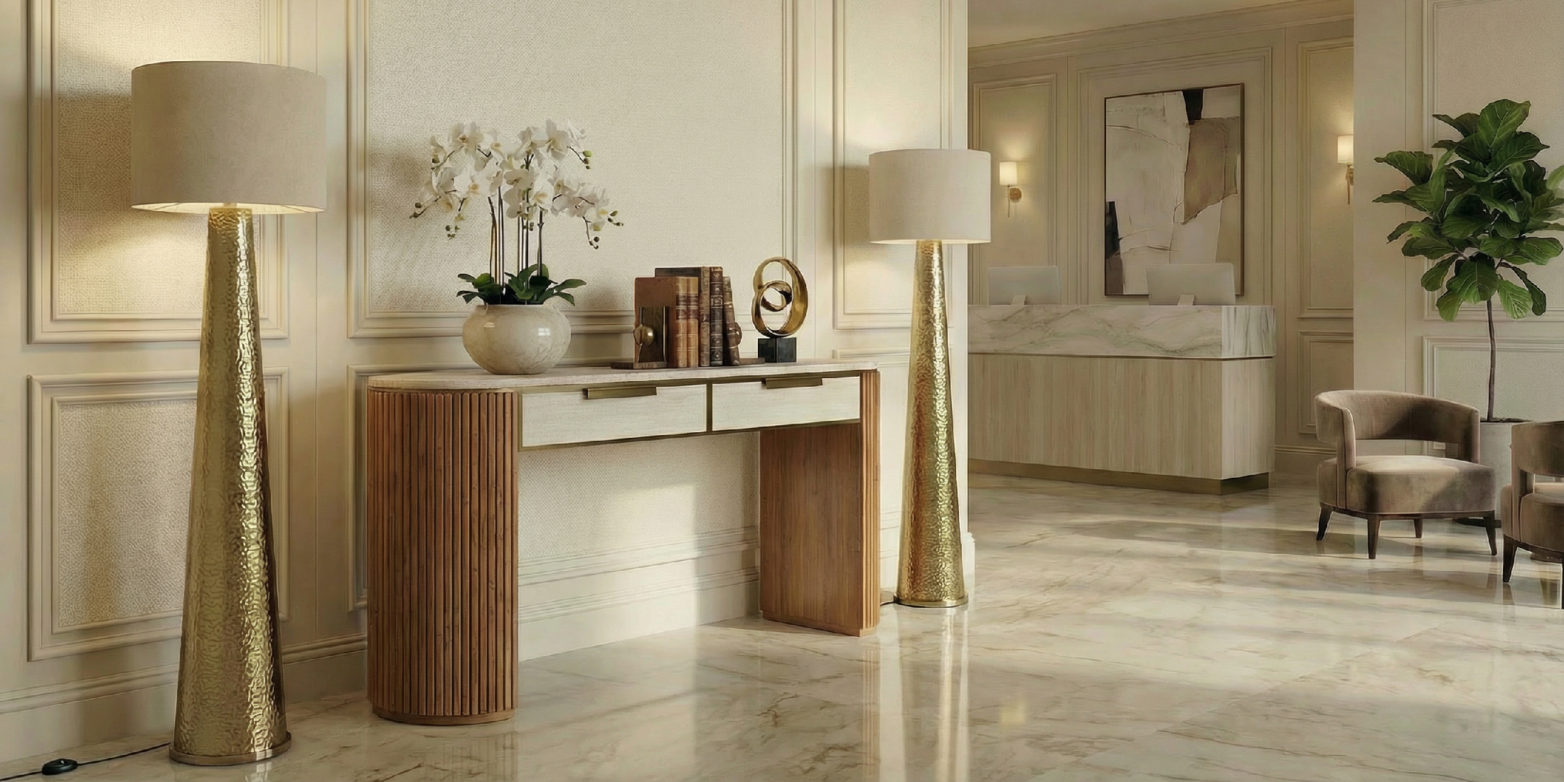 The Yves Floor Lamp is a hammered brass floor lamp with fabric shade, composed as a vertical accent for considered interiors. Its silhouette is confident yet restrained, suited to living rooms, bedrooms, and quiet hospitality settings.