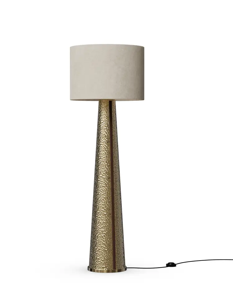 A tapered conical base in hand-worked hammered brass brings weight and tactility to the floor plane. The textured surface catches light in soft shifts, while a slim brass inlay runs upward to sharpen the geometry.
