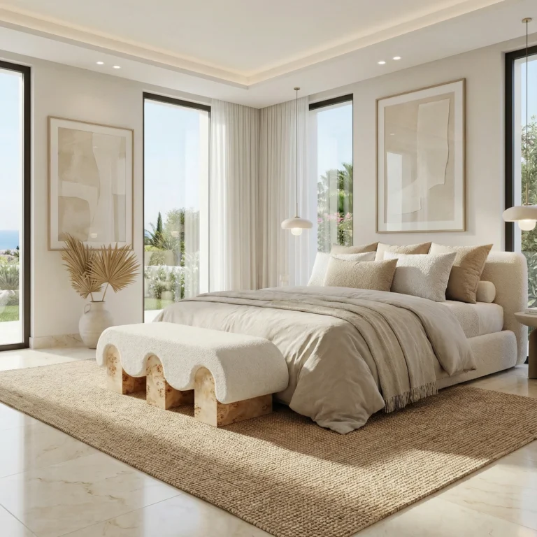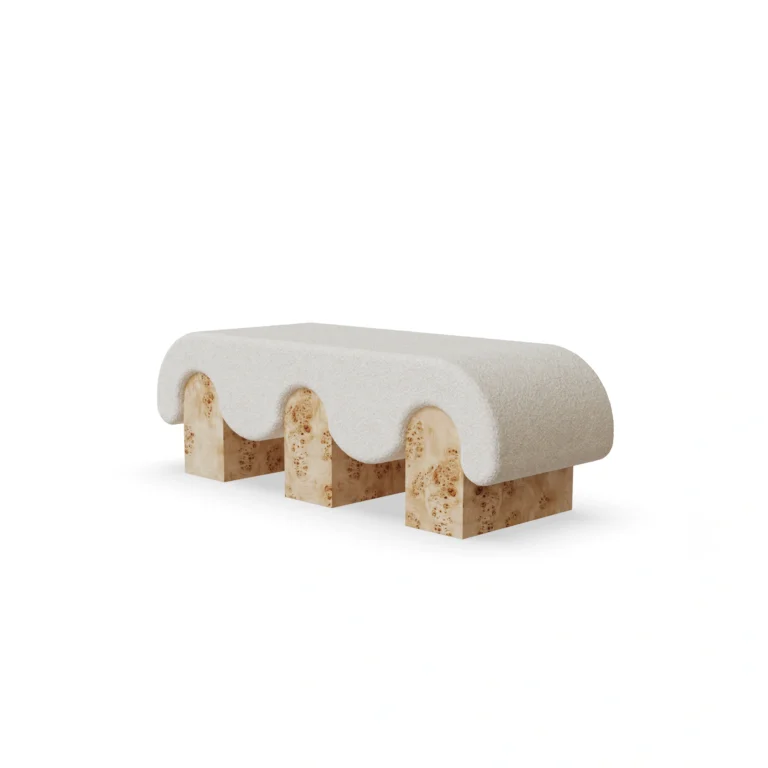 Claude bed featuring a headboard with neutral bouclé upholstery and carved varnished oak accents, sleek modern design with circular wood details on the sides. Front view